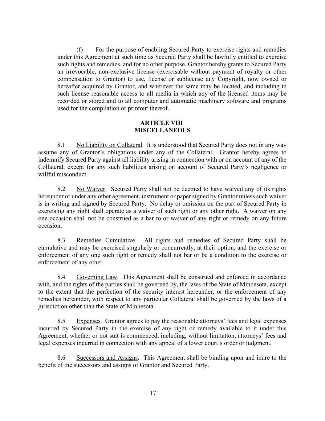 17 (f) For the purpose of enabling Secured Party to exercise rights and remedies under this Agreement at such time as Secured Party shall be lawfully entitled to exercise such rights and remedies, and for no other purpose, Grantor hereby grants to Secured Party an irrevocable, non-exclusive license (exercisable without payment of royalty or other compensation to Grantor) to use, license or sublicense any Copyright, now owned or hereafter acquired by Grantor, and wherever the same may be located, and including in such license reasonable access to all media in which any of the licensed items may be recorded or stored and to all computer and automatic machinery software and programs used for the compilation or printout thereof. ARTICLE VIII MISCELLANEOUS 8.1 No Liability on Collateral. It is understood that Secured Party does not in any way assume any of Grantor’s obligations under any of the Collateral. Grantor hereby agrees to indemnify Secured Party against all liability arising in connection with or on account of any of the Collateral, except for any such liabilities arising on account of Secured Party’s negligence or willful misconduct. 8.2 No Waiver. Secured Party shall not be deemed to have waived any of its rights hereunder or under any other agreement, instrument or paper signed by Grantor unless such waiver is in writing and signed by Secured Party. No delay or omission on the part of Secured Party in exercising any right shall operate as a waiver of such right or any other right. A waiver on any one occasion shall not be construed as a bar to or waiver of any right or remedy on any future occasion. 8.3 Remedies Cumulative. All rights and remedies of Secured Party shall be cumulative and may be exercised singularly or concurrently, at their option, and the exercise or enforcement of any one such right or remedy shall not bar or be a condition to the exercise or enforcement of any other. 8.4 Governing Law. This Agreement shall be construed and enforced in accordance with, and the rights of the parties shall be governed by, the laws of the State of Minnesota, except to the extent that the perfection of the security interest hereunder, or the enforcement of any remedies hereunder, with respect to any particular Collateral shall be governed by the laws of a jurisdiction other than the State of Minnesota. 8.5 Expenses. Grantor agrees to pay the reasonable attorneys’ fees and legal expenses incurred by Secured Party in the exercise of any right or remedy available to it under this Agreement, whether or not suit is commenced, including, without limitation, attorneys’ fees and legal expenses incurred in connection with any appeal of a lower court’s order or judgment. 8.6 Successors and Assigns. This Agreement shall be binding upon and inure to the benefit of the successors and assigns of Grantor and Secured Party.