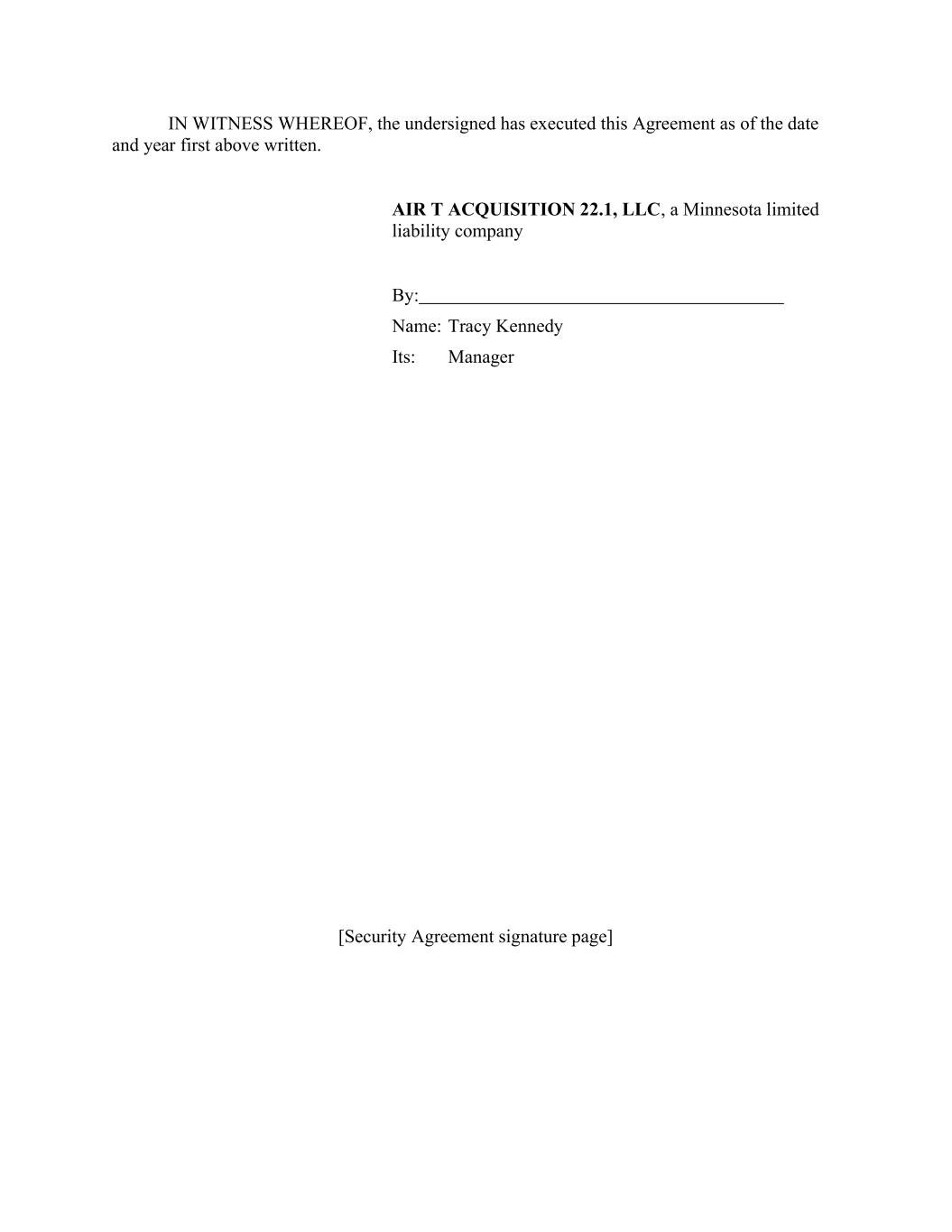 IN WITNESS WHEREOF, the undersigned has executed this Agreement as of the date and year first above written. AIR T ACQUISITION 22.1, LLC, a Minnesota limited liability company By: Name: Tracy Kennedy Its: Manager [Security Agreement signature page]