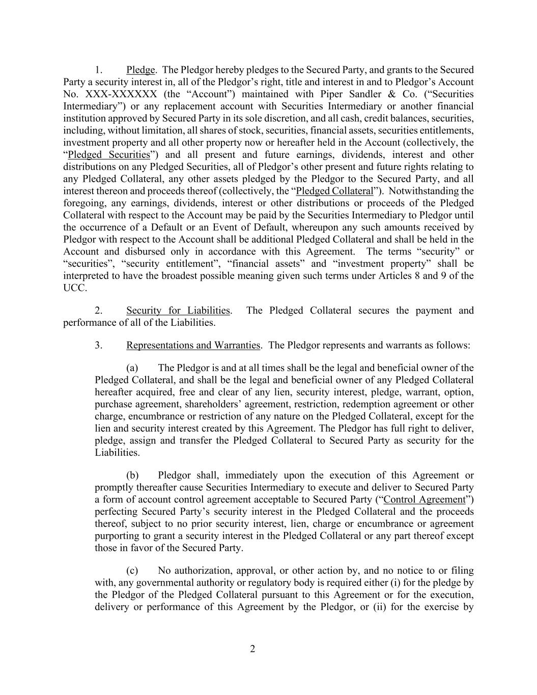 2 1. Pledge. The Pledgor hereby pledges to the Secured Party, and grants to the Secured Party a security interest in, all of the Pledgor’s right, title and interest in and to Pledgor’s Account No. XXX-XXXXXX (the “Account”) maintained with Piper Sandler & Co. (“Securities Intermediary”) or any replacement account with Securities Intermediary or another financial institution approved by Secured Party in its sole discretion, and all cash, credit balances, securities, including, without limitation, all shares of stock, securities, financial assets, securities entitlements, investment property and all other property now or hereafter held in the Account (collectively, the “Pledged Securities”) and all present and future earnings, dividends, interest and other distributions on any Pledged Securities, all of Pledgor’s other present and future rights relating to any Pledged Collateral, any other assets pledged by the Pledgor to the Secured Party, and all interest thereon and proceeds thereof (collectively, the “Pledged Collateral”). Notwithstanding the foregoing, any earnings, dividends, interest or other distributions or proceeds of the Pledged Collateral with respect to the Account may be paid by the Securities Intermediary to Pledgor until the occurrence of a Default or an Event of Default, whereupon any such amounts received by Pledgor with respect to the Account shall be additional Pledged Collateral and shall be held in the Account and disbursed only in accordance with this Agreement. The terms “security” or “securities”, “security entitlement”, “financial assets” and “investment property” shall be interpreted to have the broadest possible meaning given such terms under Articles 8 and 9 of the UCC. 2. Security for Liabilities. The Pledged Collateral secures the payment and performance of all of the Liabilities. 3. Representations and Warranties. The Pledgor represents and warrants as follows: (a) The Pledgor is and at all times shall be the legal and beneficial owner of the Pledged Collateral, and shall be the legal and beneficial owner of any Pledged Collateral hereafter acquired, free and clear of any lien, security interest, pledge, warrant, option, purchase agreement, shareholders’ agreement, restriction, redemption agreement or other charge, encumbrance or restriction of any nature on the Pledged Collateral, except for the lien and security interest created by this Agreement. The Pledgor has full right to deliver, pledge, assign and transfer the Pledged Collateral to Secured Party as security for the Liabilities. (b) Pledgor shall, immediately upon the execution of this Agreement or promptly thereafter cause Securities Intermediary to execute and deliver to Secured Party a form of account control agreement acceptable to Secured Party (“Control Agreement”) perfecting Secured Party’s security interest in the Pledged Collateral and the proceeds thereof, subject to no prior security interest, lien, charge or encumbrance or agreement purporting to grant a security interest in the Pledged Collateral or any part thereof except those in favor of the Secured Party. (c) No authorization, approval, or other action by, and no notice to or filing with, any governmental authority or regulatory body is required either (i) for the pledge by the Pledgor of the Pledged Collateral pursuant to this Agreement or for the execution, delivery or performance of this Agreement by the Pledgor, or (ii) for the exercise by