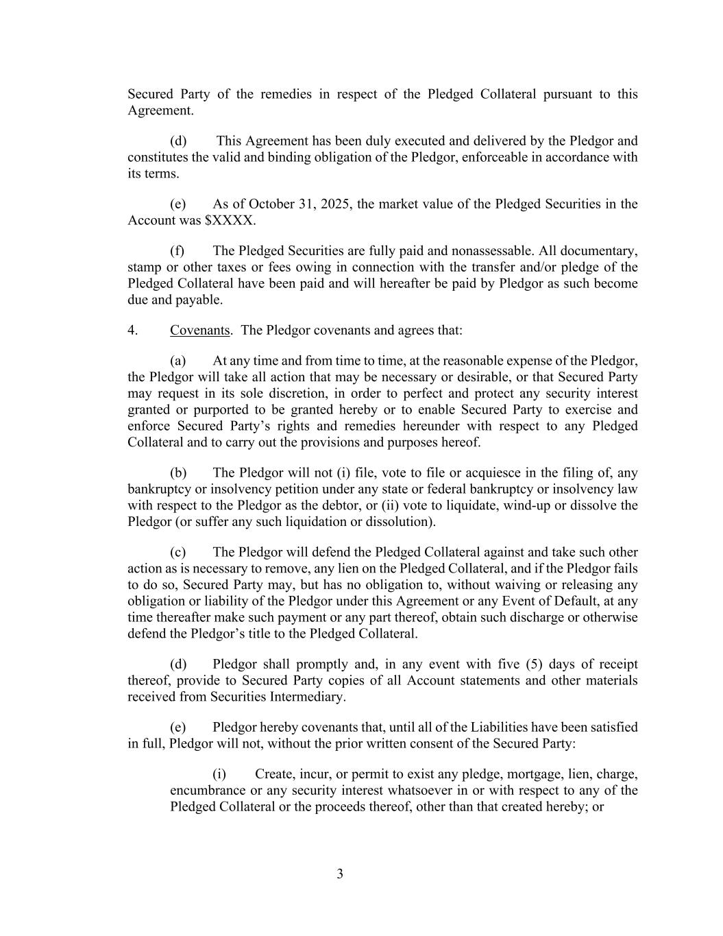 3 Secured Party of the remedies in respect of the Pledged Collateral pursuant to this Agreement. (d) This Agreement has been duly executed and delivered by the Pledgor and constitutes the valid and binding obligation of the Pledgor, enforceable in accordance with its terms. (e) As of October 31, 2025, the market value of the Pledged Securities in the Account was $XXXX. (f) The Pledged Securities are fully paid and nonassessable. All documentary, stamp or other taxes or fees owing in connection with the transfer and/or pledge of the Pledged Collateral have been paid and will hereafter be paid by Pledgor as such become due and payable. 4. Covenants. The Pledgor covenants and agrees that: (a) At any time and from time to time, at the reasonable expense of the Pledgor, the Pledgor will take all action that may be necessary or desirable, or that Secured Party may request in its sole discretion, in order to perfect and protect any security interest granted or purported to be granted hereby or to enable Secured Party to exercise and enforce Secured Party’s rights and remedies hereunder with respect to any Pledged Collateral and to carry out the provisions and purposes hereof. (b) The Pledgor will not (i) file, vote to file or acquiesce in the filing of, any bankruptcy or insolvency petition under any state or federal bankruptcy or insolvency law with respect to the Pledgor as the debtor, or (ii) vote to liquidate, wind-up or dissolve the Pledgor (or suffer any such liquidation or dissolution). (c) The Pledgor will defend the Pledged Collateral against and take such other action as is necessary to remove, any lien on the Pledged Collateral, and if the Pledgor fails to do so, Secured Party may, but has no obligation to, without waiving or releasing any obligation or liability of the Pledgor under this Agreement or any Event of Default, at any time thereafter make such payment or any part thereof, obtain such discharge or otherwise defend the Pledgor’s title to the Pledged Collateral. (d) Pledgor shall promptly and, in any event with five (5) days of receipt thereof, provide to Secured Party copies of all Account statements and other materials received from Securities Intermediary. (e) Pledgor hereby covenants that, until all of the Liabilities have been satisfied in full, Pledgor will not, without the prior written consent of the Secured Party: (i) Create, incur, or permit to exist any pledge, mortgage, lien, charge, encumbrance or any security interest whatsoever in or with respect to any of the Pledged Collateral or the proceeds thereof, other than that created hereby; or