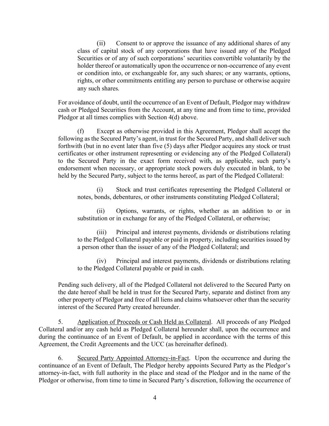 4 (ii) Consent to or approve the issuance of any additional shares of any class of capital stock of any corporations that have issued any of the Pledged Securities or of any of such corporations’ securities convertible voluntarily by the holder thereof or automatically upon the occurrence or non-occurrence of any event or condition into, or exchangeable for, any such shares; or any warrants, options, rights, or other commitments entitling any person to purchase or otherwise acquire any such shares. For avoidance of doubt, until the occurrence of an Event of Default, Pledgor may withdraw cash or Pledged Securities from the Account, at any time and from time to time, provided Pledgor at all times complies with Section 4(d) above. (f) Except as otherwise provided in this Agreement, Pledgor shall accept the following as the Secured Party’s agent, in trust for the Secured Party, and shall deliver such forthwith (but in no event later than five (5) days after Pledgor acquires any stock or trust certificates or other instrument representing or evidencing any of the Pledged Collateral) to the Secured Party in the exact form received with, as applicable, such party’s endorsement when necessary, or appropriate stock powers duly executed in blank, to be held by the Secured Party, subject to the terms hereof, as part of the Pledged Collateral: (i) Stock and trust certificates representing the Pledged Collateral or notes, bonds, debentures, or other instruments constituting Pledged Collateral; (ii) Options, warrants, or rights, whether as an addition to or in substitution or in exchange for any of the Pledged Collateral, or otherwise; (iii) Principal and interest payments, dividends or distributions relating to the Pledged Collateral payable or paid in property, including securities issued by a person other than the issuer of any of the Pledged Collateral; and (iv) Principal and interest payments, dividends or distributions relating to the Pledged Collateral payable or paid in cash. Pending such delivery, all of the Pledged Collateral not delivered to the Secured Party on the date hereof shall be held in trust for the Secured Party, separate and distinct from any other property of Pledgor and free of all liens and claims whatsoever other than the security interest of the Secured Party created hereunder. 5. Application of Proceeds or Cash Held as Collateral. All proceeds of any Pledged Collateral and/or any cash held as Pledged Collateral hereunder shall, upon the occurrence and during the continuance of an Event of Default, be applied in accordance with the terms of this Agreement, the Credit Agreements and the UCC (as hereinafter defined). 6. Secured Party Appointed Attorney-in-Fact. Upon the occurrence and during the continuance of an Event of Default, The Pledgor hereby appoints Secured Party as the Pledgor’s attorney-in-fact, with full authority in the place and stead of the Pledgor and in the name of the Pledgor or otherwise, from time to time in Secured Party’s discretion, following the occurrence of