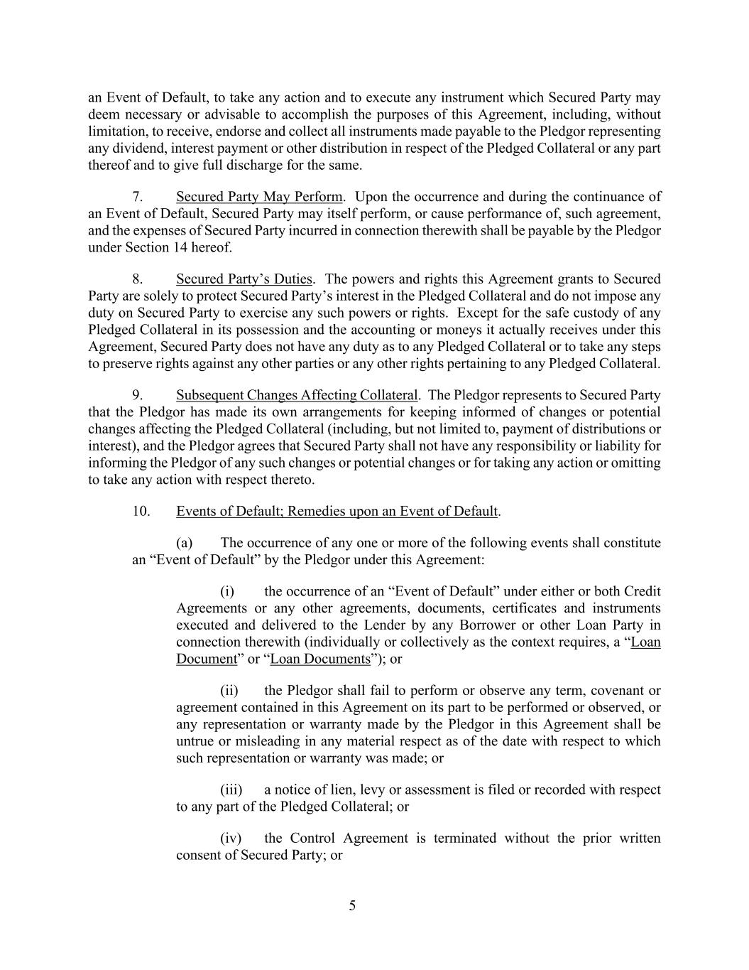 5 an Event of Default, to take any action and to execute any instrument which Secured Party may deem necessary or advisable to accomplish the purposes of this Agreement, including, without limitation, to receive, endorse and collect all instruments made payable to the Pledgor representing any dividend, interest payment or other distribution in respect of the Pledged Collateral or any part thereof and to give full discharge for the same. 7. Secured Party May Perform. Upon the occurrence and during the continuance of an Event of Default, Secured Party may itself perform, or cause performance of, such agreement, and the expenses of Secured Party incurred in connection therewith shall be payable by the Pledgor under Section 14 hereof. 8. Secured Party’s Duties. The powers and rights this Agreement grants to Secured Party are solely to protect Secured Party’s interest in the Pledged Collateral and do not impose any duty on Secured Party to exercise any such powers or rights. Except for the safe custody of any Pledged Collateral in its possession and the accounting or moneys it actually receives under this Agreement, Secured Party does not have any duty as to any Pledged Collateral or to take any steps to preserve rights against any other parties or any other rights pertaining to any Pledged Collateral. 9. Subsequent Changes Affecting Collateral. The Pledgor represents to Secured Party that the Pledgor has made its own arrangements for keeping informed of changes or potential changes affecting the Pledged Collateral (including, but not limited to, payment of distributions or interest), and the Pledgor agrees that Secured Party shall not have any responsibility or liability for informing the Pledgor of any such changes or potential changes or for taking any action or omitting to take any action with respect thereto. 10. Events of Default; Remedies upon an Event of Default. (a) The occurrence of any one or more of the following events shall constitute an “Event of Default” by the Pledgor under this Agreement: (i) the occurrence of an “Event of Default” under either or both Credit Agreements or any other agreements, documents, certificates and instruments executed and delivered to the Lender by any Borrower or other Loan Party in connection therewith (individually or collectively as the context requires, a “Loan Document” or “Loan Documents”); or (ii) the Pledgor shall fail to perform or observe any term, covenant or agreement contained in this Agreement on its part to be performed or observed, or any representation or warranty made by the Pledgor in this Agreement shall be untrue or misleading in any material respect as of the date with respect to which such representation or warranty was made; or (iii) a notice of lien, levy or assessment is filed or recorded with respect to any part of the Pledged Collateral; or (iv) the Control Agreement is terminated without the prior written consent of Secured Party; or