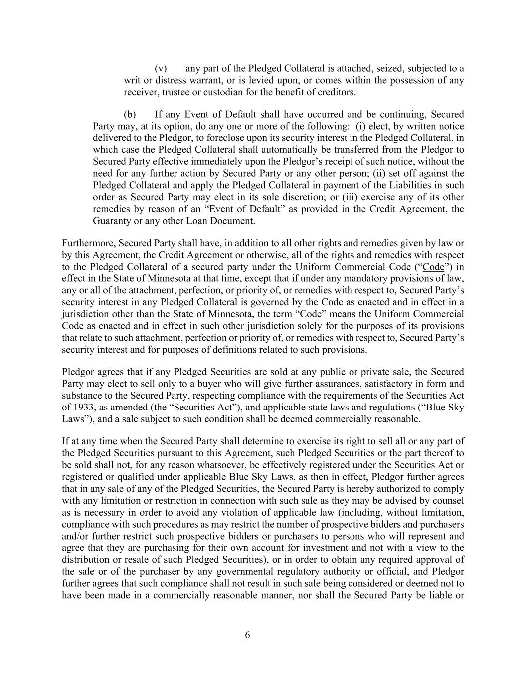 6 (v) any part of the Pledged Collateral is attached, seized, subjected to a writ or distress warrant, or is levied upon, or comes within the possession of any receiver, trustee or custodian for the benefit of creditors. (b) If any Event of Default shall have occurred and be continuing, Secured Party may, at its option, do any one or more of the following: (i) elect, by written notice delivered to the Pledgor, to foreclose upon its security interest in the Pledged Collateral, in which case the Pledged Collateral shall automatically be transferred from the Pledgor to Secured Party effective immediately upon the Pledgor’s receipt of such notice, without the need for any further action by Secured Party or any other person; (ii) set off against the Pledged Collateral and apply the Pledged Collateral in payment of the Liabilities in such order as Secured Party may elect in its sole discretion; or (iii) exercise any of its other remedies by reason of an “Event of Default” as provided in the Credit Agreement, the Guaranty or any other Loan Document. Furthermore, Secured Party shall have, in addition to all other rights and remedies given by law or by this Agreement, the Credit Agreement or otherwise, all of the rights and remedies with respect to the Pledged Collateral of a secured party under the Uniform Commercial Code (“Code”) in effect in the State of Minnesota at that time, except that if under any mandatory provisions of law, any or all of the attachment, perfection, or priority of, or remedies with respect to, Secured Party’s security interest in any Pledged Collateral is governed by the Code as enacted and in effect in a jurisdiction other than the State of Minnesota, the term “Code” means the Uniform Commercial Code as enacted and in effect in such other jurisdiction solely for the purposes of its provisions that relate to such attachment, perfection or priority of, or remedies with respect to, Secured Party’s security interest and for purposes of definitions related to such provisions. Pledgor agrees that if any Pledged Securities are sold at any public or private sale, the Secured Party may elect to sell only to a buyer who will give further assurances, satisfactory in form and substance to the Secured Party, respecting compliance with the requirements of the Securities Act of 1933, as amended (the “Securities Act”), and applicable state laws and regulations (“Blue Sky Laws”), and a sale subject to such condition shall be deemed commercially reasonable. If at any time when the Secured Party shall determine to exercise its right to sell all or any part of the Pledged Securities pursuant to this Agreement, such Pledged Securities or the part thereof to be sold shall not, for any reason whatsoever, be effectively registered under the Securities Act or registered or qualified under applicable Blue Sky Laws, as then in effect, Pledgor further agrees that in any sale of any of the Pledged Securities, the Secured Party is hereby authorized to comply with any limitation or restriction in connection with such sale as they may be advised by counsel as is necessary in order to avoid any violation of applicable law (including, without limitation, compliance with such procedures as may restrict the number of prospective bidders and purchasers and/or further restrict such prospective bidders or purchasers to persons who will represent and agree that they are purchasing for their own account for investment and not with a view to the distribution or resale of such Pledged Securities), or in order to obtain any required approval of the sale or of the purchaser by any governmental regulatory authority or official, and Pledgor further agrees that such compliance shall not result in such sale being considered or deemed not to have been made in a commercially reasonable manner, nor shall the Secured Party be liable or