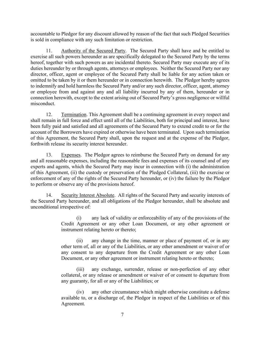 7 accountable to Pledgor for any discount allowed by reason of the fact that such Pledged Securities is sold in compliance with any such limitation or restriction. 11. Authority of the Secured Party. The Secured Party shall have and be entitled to exercise all such powers hereunder as are specifically delegated to the Secured Party by the terms hereof, together with such powers as are incidental thereto. Secured Party may execute any of its duties hereunder by or through agents, attorneys or employees. Neither the Secured Party nor any director, officer, agent or employee of the Secured Party shall be liable for any action taken or omitted to be taken by it or them hereunder or in connection herewith. The Pledgor hereby agrees to indemnify and hold harmless the Secured Party and/or any such director, officer, agent, attorney or employee from and against any and all liability incurred by any of them, hereunder or in connection herewith, except to the extent arising out of Secured Party’s gross negligence or willful misconduct. 12. Termination. This Agreement shall be a continuing agreement in every respect and shall remain in full force and effect until all of the Liabilities, both for principal and interest, have been fully paid and satisfied and all agreements of the Secured Party to extend credit to or for the account of the Borrowers have expired or otherwise have been terminated. Upon such termination of this Agreement, the Secured Party shall, upon the request and at the expense of the Pledgor, forthwith release its security interest hereunder. 13. Expenses. The Pledgor agrees to reimburse the Secured Party on demand for any and all reasonable expenses, including the reasonable fees and expenses of its counsel and of any experts and agents, which the Secured Party may incur in connection with (i) the administration of this Agreement, (ii) the custody or preservation of the Pledged Collateral, (iii) the exercise or enforcement of any of the rights of the Secured Party hereunder, or (iv) the failure by the Pledgor to perform or observe any of the provisions hereof. 14. Security Interest Absolute. All rights of the Secured Party and security interests of the Secured Party hereunder, and all obligations of the Pledgor hereunder, shall be absolute and unconditional irrespective of: (i) any lack of validity or enforceability of any of the provisions of the Credit Agreement or any other Loan Document, or any other agreement or instrument relating hereto or thereto; (ii) any change in the time, manner or place of payment of, or in any other term of, all or any of the Liabilities, or any other amendment or waiver of or any consent to any departure from the Credit Agreement or any other Loan Document, or any other agreement or instrument relating hereto or thereto; (iii) any exchange, surrender, release or non-perfection of any other collateral, or any release or amendment or waiver of or consent to departure from any guaranty, for all or any of the Liabilities; or (iv) any other circumstance which might otherwise constitute a defense available to, or a discharge of, the Pledgor in respect of the Liabilities or of this Agreement.