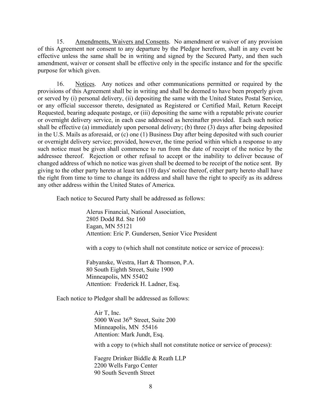 8 15. Amendments, Waivers and Consents. No amendment or waiver of any provision of this Agreement nor consent to any departure by the Pledgor herefrom, shall in any event be effective unless the same shall be in writing and signed by the Secured Party, and then such amendment, waiver or consent shall be effective only in the specific instance and for the specific purpose for which given. 16. Notices. Any notices and other communications permitted or required by the provisions of this Agreement shall be in writing and shall be deemed to have been properly given or served by (i) personal delivery, (ii) depositing the same with the United States Postal Service, or any official successor thereto, designated as Registered or Certified Mail, Return Receipt Requested, bearing adequate postage, or (iii) depositing the same with a reputable private courier or overnight delivery service, in each case addressed as hereinafter provided. Each such notice shall be effective (a) immediately upon personal delivery; (b) three (3) days after being deposited in the U.S. Mails as aforesaid, or (c) one (1) Business Day after being deposited with such courier or overnight delivery service; provided, however, the time period within which a response to any such notice must be given shall commence to run from the date of receipt of the notice by the addressee thereof. Rejection or other refusal to accept or the inability to deliver because of changed address of which no notice was given shall be deemed to be receipt of the notice sent. By giving to the other party hereto at least ten (10) days' notice thereof, either party hereto shall have the right from time to time to change its address and shall have the right to specify as its address any other address within the United States of America. Each notice to Secured Party shall be addressed as follows: Alerus Financial, National Association, 2805 Dodd Rd. Ste 160 Eagan, MN 55121 Attention: Eric P. Gundersen, Senior Vice President with a copy to (which shall not constitute notice or service of process): Fabyanske, Westra, Hart & Thomson, P.A. 80 South Eighth Street, Suite 1900 Minneapolis, MN 55402 Attention: Frederick H. Ladner, Esq. Each notice to Pledgor shall be addressed as follows: Air T, Inc. 5000 West 36th Street, Suite 200 Minneapolis, MN 55416 Attention: Mark Jundt, Esq. with a copy to (which shall not constitute notice or service of process): Faegre Drinker Biddle & Reath LLP 2200 Wells Fargo Center 90 South Seventh Street