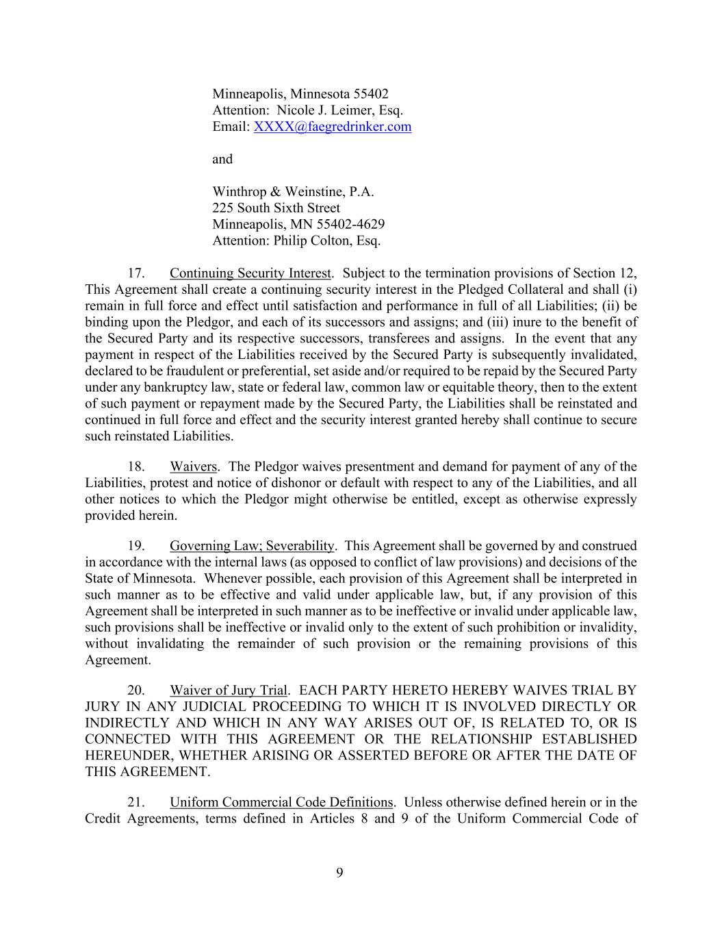 9 Minneapolis, Minnesota 55402 Attention: Nicole J. Leimer, Esq. Email: XXXX@faegredrinker.com and Winthrop & Weinstine, P.A. 225 South Sixth Street Minneapolis, MN 55402-4629 Attention: Philip Colton, Esq. 17. Continuing Security Interest. Subject to the termination provisions of Section 12, This Agreement shall create a continuing security interest in the Pledged Collateral and shall (i) remain in full force and effect until satisfaction and performance in full of all Liabilities; (ii) be binding upon the Pledgor, and each of its successors and assigns; and (iii) inure to the benefit of the Secured Party and its respective successors, transferees and assigns. In the event that any payment in respect of the Liabilities received by the Secured Party is subsequently invalidated, declared to be fraudulent or preferential, set aside and/or required to be repaid by the Secured Party under any bankruptcy law, state or federal law, common law or equitable theory, then to the extent of such payment or repayment made by the Secured Party, the Liabilities shall be reinstated and continued in full force and effect and the security interest granted hereby shall continue to secure such reinstated Liabilities. 18. Waivers. The Pledgor waives presentment and demand for payment of any of the Liabilities, protest and notice of dishonor or default with respect to any of the Liabilities, and all other notices to which the Pledgor might otherwise be entitled, except as otherwise expressly provided herein. 19. Governing Law; Severability. This Agreement shall be governed by and construed in accordance with the internal laws (as opposed to conflict of law provisions) and decisions of the State of Minnesota. Whenever possible, each provision of this Agreement shall be interpreted in such manner as to be effective and valid under applicable law, but, if any provision of this Agreement shall be interpreted in such manner as to be ineffective or invalid under applicable law, such provisions shall be ineffective or invalid only to the extent of such prohibition or invalidity, without invalidating the remainder of such provision or the remaining provisions of this Agreement. 20. Waiver of Jury Trial. EACH PARTY HERETO HEREBY WAIVES TRIAL BY JURY IN ANY JUDICIAL PROCEEDING TO WHICH IT IS INVOLVED DIRECTLY OR INDIRECTLY AND WHICH IN ANY WAY ARISES OUT OF, IS RELATED TO, OR IS CONNECTED WITH THIS AGREEMENT OR THE RELATIONSHIP ESTABLISHED HEREUNDER, WHETHER ARISING OR ASSERTED BEFORE OR AFTER THE DATE OF THIS AGREEMENT. 21. Uniform Commercial Code Definitions. Unless otherwise defined herein or in the Credit Agreements, terms defined in Articles 8 and 9 of the Uniform Commercial Code of