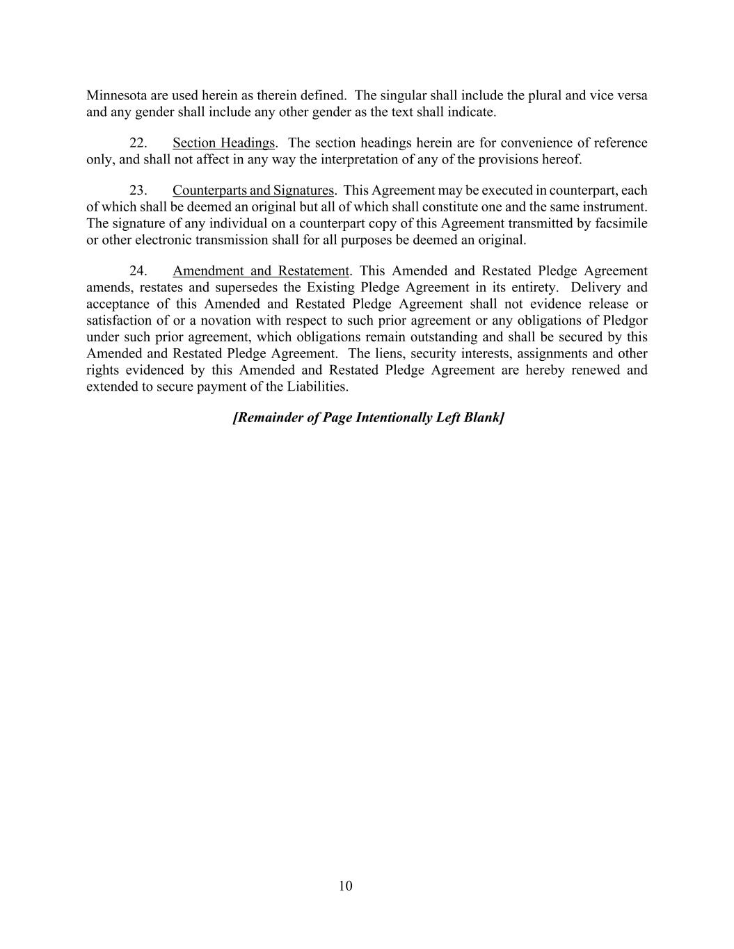 10 Minnesota are used herein as therein defined. The singular shall include the plural and vice versa and any gender shall include any other gender as the text shall indicate. 22. Section Headings. The section headings herein are for convenience of reference only, and shall not affect in any way the interpretation of any of the provisions hereof. 23. Counterparts and Signatures. This Agreement may be executed in counterpart, each of which shall be deemed an original but all of which shall constitute one and the same instrument. The signature of any individual on a counterpart copy of this Agreement transmitted by facsimile or other electronic transmission shall for all purposes be deemed an original. 24. Amendment and Restatement. This Amended and Restated Pledge Agreement amends, restates and supersedes the Existing Pledge Agreement in its entirety. Delivery and acceptance of this Amended and Restated Pledge Agreement shall not evidence release or satisfaction of or a novation with respect to such prior agreement or any obligations of Pledgor under such prior agreement, which obligations remain outstanding and shall be secured by this Amended and Restated Pledge Agreement. The liens, security interests, assignments and other rights evidenced by this Amended and Restated Pledge Agreement are hereby renewed and extended to secure payment of the Liabilities. [Remainder of Page Intentionally Left Blank]