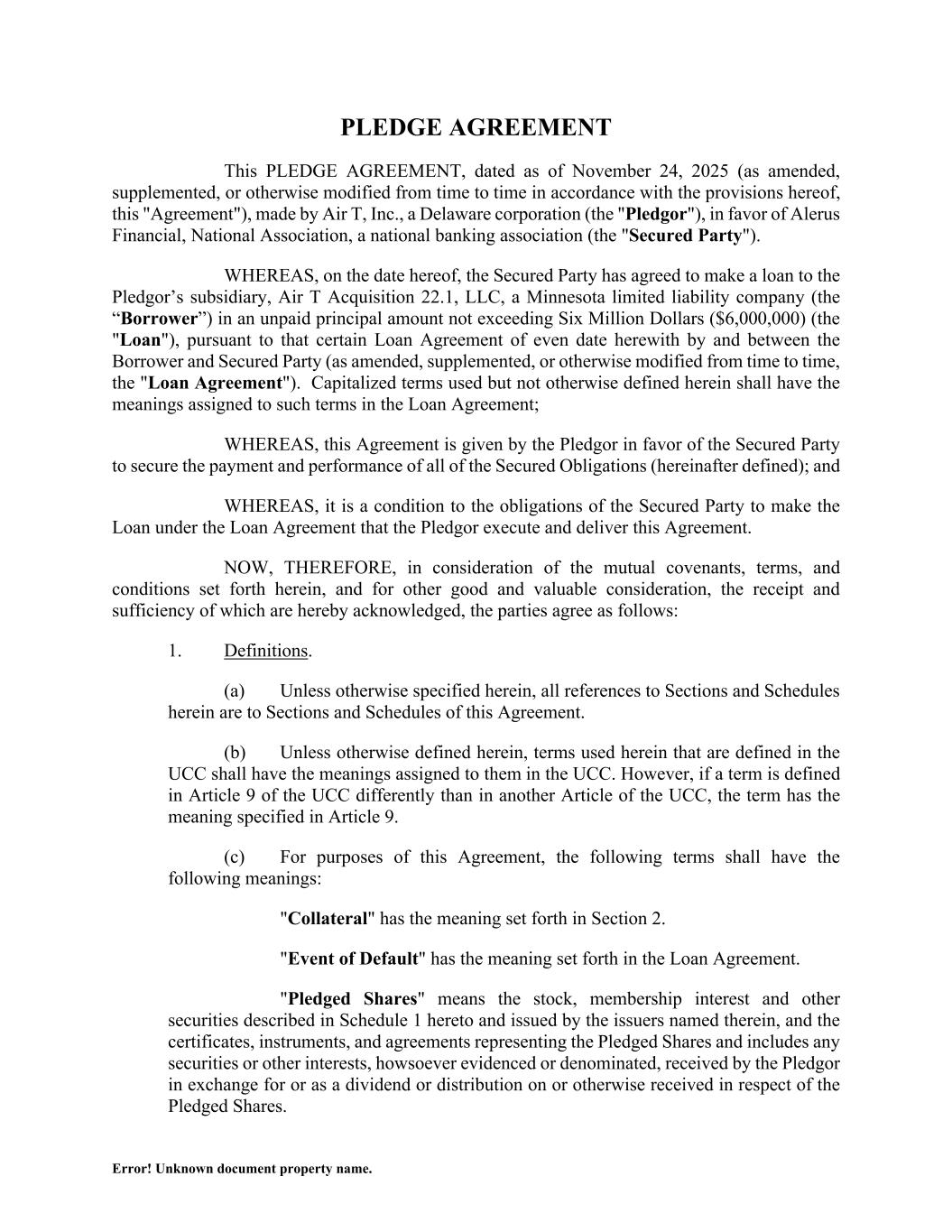 Error! Unknown document property name. PLEDGE AGREEMENT This PLEDGE AGREEMENT, dated as of November 24, 2025 (as amended, supplemented, or otherwise modified from time to time in accordance with the provisions hereof, this "Agreement"), made by Air T, Inc., a Delaware corporation (the "Pledgor"), in favor of Alerus Financial, National Association, a national banking association (the "Secured Party"). WHEREAS, on the date hereof, the Secured Party has agreed to make a loan to the Pledgor’s subsidiary, Air T Acquisition 22.1, LLC, a Minnesota limited liability company (the “Borrower”) in an unpaid principal amount not exceeding Six Million Dollars ($6,000,000) (the "Loan"), pursuant to that certain Loan Agreement of even date herewith by and between the Borrower and Secured Party (as amended, supplemented, or otherwise modified from time to time, the "Loan Agreement"). Capitalized terms used but not otherwise defined herein shall have the meanings assigned to such terms in the Loan Agreement; WHEREAS, this Agreement is given by the Pledgor in favor of the Secured Party to secure the payment and performance of all of the Secured Obligations (hereinafter defined); and WHEREAS, it is a condition to the obligations of the Secured Party to make the Loan under the Loan Agreement that the Pledgor execute and deliver this Agreement. NOW, THEREFORE, in consideration of the mutual covenants, terms, and conditions set forth herein, and for other good and valuable consideration, the receipt and sufficiency of which are hereby acknowledged, the parties agree as follows: 1. Definitions. (a) Unless otherwise specified herein, all references to Sections and Schedules herein are to Sections and Schedules of this Agreement. (b) Unless otherwise defined herein, terms used herein that are defined in the UCC shall have the meanings assigned to them in the UCC. However, if a term is defined in Article 9 of the UCC differently than in another Article of the UCC, the term has the meaning specified in Article 9. (c) For purposes of this Agreement, the following terms shall have the following meanings: "Collateral" has the meaning set forth in Section 2. "Event of Default" has the meaning set forth in the Loan Agreement. "Pledged Shares" means the stock, membership interest and other securities described in Schedule 1 hereto and issued by the issuers named therein, and the certificates, instruments, and agreements representing the Pledged Shares and includes any securities or other interests, howsoever evidenced or denominated, received by the Pledgor in exchange for or as a dividend or distribution on or otherwise received in respect of the Pledged Shares.