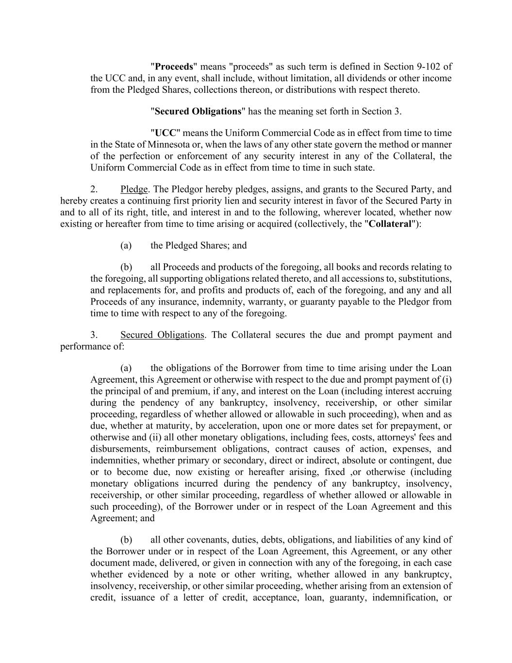 "Proceeds" means "proceeds" as such term is defined in Section 9-102 of the UCC and, in any event, shall include, without limitation, all dividends or other income from the Pledged Shares, collections thereon, or distributions with respect thereto. "Secured Obligations" has the meaning set forth in Section 3. "UCC" means the Uniform Commercial Code as in effect from time to time in the State of Minnesota or, when the laws of any other state govern the method or manner of the perfection or enforcement of any security interest in any of the Collateral, the Uniform Commercial Code as in effect from time to time in such state. 2. Pledge. The Pledgor hereby pledges, assigns, and grants to the Secured Party, and hereby creates a continuing first priority lien and security interest in favor of the Secured Party in and to all of its right, title, and interest in and to the following, wherever located, whether now existing or hereafter from time to time arising or acquired (collectively, the "Collateral"): (a) the Pledged Shares; and (b) all Proceeds and products of the foregoing, all books and records relating to the foregoing, all supporting obligations related thereto, and all accessions to, substitutions, and replacements for, and profits and products of, each of the foregoing, and any and all Proceeds of any insurance, indemnity, warranty, or guaranty payable to the Pledgor from time to time with respect to any of the foregoing. 3. Secured Obligations. The Collateral secures the due and prompt payment and performance of: (a) the obligations of the Borrower from time to time arising under the Loan Agreement, this Agreement or otherwise with respect to the due and prompt payment of (i) the principal of and premium, if any, and interest on the Loan (including interest accruing during the pendency of any bankruptcy, insolvency, receivership, or other similar proceeding, regardless of whether allowed or allowable in such proceeding), when and as due, whether at maturity, by acceleration, upon one or more dates set for prepayment, or otherwise and (ii) all other monetary obligations, including fees, costs, attorneys' fees and disbursements, reimbursement obligations, contract causes of action, expenses, and indemnities, whether primary or secondary, direct or indirect, absolute or contingent, due or to become due, now existing or hereafter arising, fixed ,or otherwise (including monetary obligations incurred during the pendency of any bankruptcy, insolvency, receivership, or other similar proceeding, regardless of whether allowed or allowable in such proceeding), of the Borrower under or in respect of the Loan Agreement and this Agreement; and (b) all other covenants, duties, debts, obligations, and liabilities of any kind of the Borrower under or in respect of the Loan Agreement, this Agreement, or any other document made, delivered, or given in connection with any of the foregoing, in each case whether evidenced by a note or other writing, whether allowed in any bankruptcy, insolvency, receivership, or other similar proceeding, whether arising from an extension of credit, issuance of a letter of credit, acceptance, loan, guaranty, indemnification, or