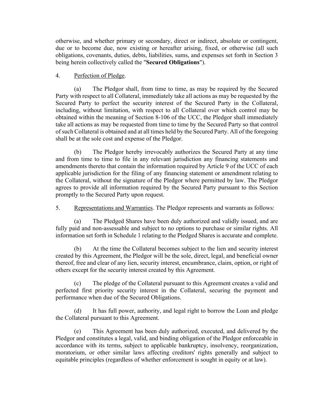 otherwise, and whether primary or secondary, direct or indirect, absolute or contingent, due or to become due, now existing or hereafter arising, fixed, or otherwise (all such obligations, covenants, duties, debts, liabilities, sums, and expenses set forth in Section 3 being herein collectively called the "Secured Obligations"). 4. Perfection of Pledge. (a) The Pledgor shall, from time to time, as may be required by the Secured Party with respect to all Collateral, immediately take all actions as may be requested by the Secured Party to perfect the security interest of the Secured Party in the Collateral, including, without limitation, with respect to all Collateral over which control may be obtained within the meaning of Section 8-106 of the UCC, the Pledgor shall immediately take all actions as may be requested from time to time by the Secured Party so that control of such Collateral is obtained and at all times held by the Secured Party. All of the foregoing shall be at the sole cost and expense of the Pledgor. (b) The Pledgor hereby irrevocably authorizes the Secured Party at any time and from time to time to file in any relevant jurisdiction any financing statements and amendments thereto that contain the information required by Article 9 of the UCC of each applicable jurisdiction for the filing of any financing statement or amendment relating to the Collateral, without the signature of the Pledgor where permitted by law. The Pledgor agrees to provide all information required by the Secured Party pursuant to this Section promptly to the Secured Party upon request. 5. Representations and Warranties. The Pledgor represents and warrants as follows: (a) The Pledged Shares have been duly authorized and validly issued, and are fully paid and non-assessable and subject to no options to purchase or similar rights. All information set forth in Schedule 1 relating to the Pledged Shares is accurate and complete. (b) At the time the Collateral becomes subject to the lien and security interest created by this Agreement, the Pledgor will be the sole, direct, legal, and beneficial owner thereof, free and clear of any lien, security interest, encumbrance, claim, option, or right of others except for the security interest created by this Agreement. (c) The pledge of the Collateral pursuant to this Agreement creates a valid and perfected first priority security interest in the Collateral, securing the payment and performance when due of the Secured Obligations. (d) It has full power, authority, and legal right to borrow the Loan and pledge the Collateral pursuant to this Agreement. (e) This Agreement has been duly authorized, executed, and delivered by the Pledgor and constitutes a legal, valid, and binding obligation of the Pledgor enforceable in accordance with its terms, subject to applicable bankruptcy, insolvency, reorganization, moratorium, or other similar laws affecting creditors' rights generally and subject to equitable principles (regardless of whether enforcement is sought in equity or at law).