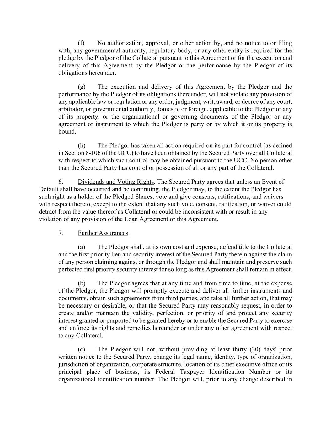 (f) No authorization, approval, or other action by, and no notice to or filing with, any governmental authority, regulatory body, or any other entity is required for the pledge by the Pledgor of the Collateral pursuant to this Agreement or for the execution and delivery of this Agreement by the Pledgor or the performance by the Pledgor of its obligations hereunder. (g) The execution and delivery of this Agreement by the Pledgor and the performance by the Pledgor of its obligations thereunder, will not violate any provision of any applicable law or regulation or any order, judgment, writ, award, or decree of any court, arbitrator, or governmental authority, domestic or foreign, applicable to the Pledgor or any of its property, or the organizational or governing documents of the Pledgor or any agreement or instrument to which the Pledgor is party or by which it or its property is bound. (h) The Pledgor has taken all action required on its part for control (as defined in Section 8-106 of the UCC) to have been obtained by the Secured Party over all Collateral with respect to which such control may be obtained pursuant to the UCC. No person other than the Secured Party has control or possession of all or any part of the Collateral. 6. Dividends and Voting Rights. The Secured Party agrees that unless an Event of Default shall have occurred and be continuing, the Pledgor may, to the extent the Pledgor has such right as a holder of the Pledged Shares, vote and give consents, ratifications, and waivers with respect thereto, except to the extent that any such vote, consent, ratification, or waiver could detract from the value thereof as Collateral or could be inconsistent with or result in any violation of any provision of the Loan Agreement or this Agreement. 7. Further Assurances. (a) The Pledgor shall, at its own cost and expense, defend title to the Collateral and the first priority lien and security interest of the Secured Party therein against the claim of any person claiming against or through the Pledgor and shall maintain and preserve such perfected first priority security interest for so long as this Agreement shall remain in effect. (b) The Pledgor agrees that at any time and from time to time, at the expense of the Pledgor, the Pledgor will promptly execute and deliver all further instruments and documents, obtain such agreements from third parties, and take all further action, that may be necessary or desirable, or that the Secured Party may reasonably request, in order to create and/or maintain the validity, perfection, or priority of and protect any security interest granted or purported to be granted hereby or to enable the Secured Party to exercise and enforce its rights and remedies hereunder or under any other agreement with respect to any Collateral. (c) The Pledgor will not, without providing at least thirty (30) days' prior written notice to the Secured Party, change its legal name, identity, type of organization, jurisdiction of organization, corporate structure, location of its chief executive office or its principal place of business, its Federal Taxpayer Identification Number or its organizational identification number. The Pledgor will, prior to any change described in