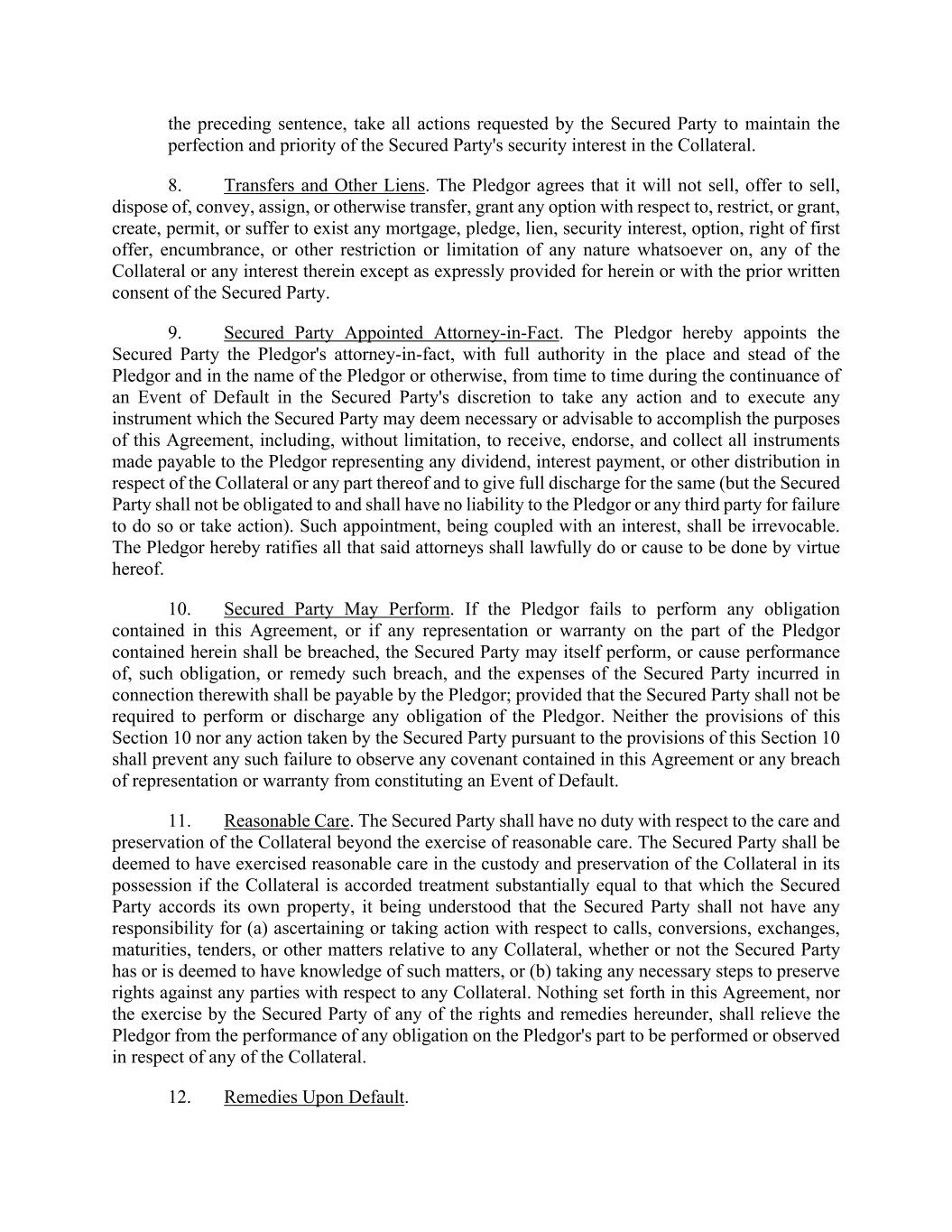 the preceding sentence, take all actions requested by the Secured Party to maintain the perfection and priority of the Secured Party's security interest in the Collateral. 8. Transfers and Other Liens. The Pledgor agrees that it will not sell, offer to sell, dispose of, convey, assign, or otherwise transfer, grant any option with respect to, restrict, or grant, create, permit, or suffer to exist any mortgage, pledge, lien, security interest, option, right of first offer, encumbrance, or other restriction or limitation of any nature whatsoever on, any of the Collateral or any interest therein except as expressly provided for herein or with the prior written consent of the Secured Party. 9. Secured Party Appointed Attorney-in-Fact. The Pledgor hereby appoints the Secured Party the Pledgor's attorney-in-fact, with full authority in the place and stead of the Pledgor and in the name of the Pledgor or otherwise, from time to time during the continuance of an Event of Default in the Secured Party's discretion to take any action and to execute any instrument which the Secured Party may deem necessary or advisable to accomplish the purposes of this Agreement, including, without limitation, to receive, endorse, and collect all instruments made payable to the Pledgor representing any dividend, interest payment, or other distribution in respect of the Collateral or any part thereof and to give full discharge for the same (but the Secured Party shall not be obligated to and shall have no liability to the Pledgor or any third party for failure to do so or take action). Such appointment, being coupled with an interest, shall be irrevocable. The Pledgor hereby ratifies all that said attorneys shall lawfully do or cause to be done by virtue hereof. 10. Secured Party May Perform. If the Pledgor fails to perform any obligation contained in this Agreement, or if any representation or warranty on the part of the Pledgor contained herein shall be breached, the Secured Party may itself perform, or cause performance of, such obligation, or remedy such breach, and the expenses of the Secured Party incurred in connection therewith shall be payable by the Pledgor; provided that the Secured Party shall not be required to perform or discharge any obligation of the Pledgor. Neither the provisions of this Section 10 nor any action taken by the Secured Party pursuant to the provisions of this Section 10 shall prevent any such failure to observe any covenant contained in this Agreement or any breach of representation or warranty from constituting an Event of Default. 11. Reasonable Care. The Secured Party shall have no duty with respect to the care and preservation of the Collateral beyond the exercise of reasonable care. The Secured Party shall be deemed to have exercised reasonable care in the custody and preservation of the Collateral in its possession if the Collateral is accorded treatment substantially equal to that which the Secured Party accords its own property, it being understood that the Secured Party shall not have any responsibility for (a) ascertaining or taking action with respect to calls, conversions, exchanges, maturities, tenders, or other matters relative to any Collateral, whether or not the Secured Party has or is deemed to have knowledge of such matters, or (b) taking any necessary steps to preserve rights against any parties with respect to any Collateral. Nothing set forth in this Agreement, nor the exercise by the Secured Party of any of the rights and remedies hereunder, shall relieve the Pledgor from the performance of any obligation on the Pledgor's part to be performed or observed in respect of any of the Collateral. 12. Remedies Upon Default.