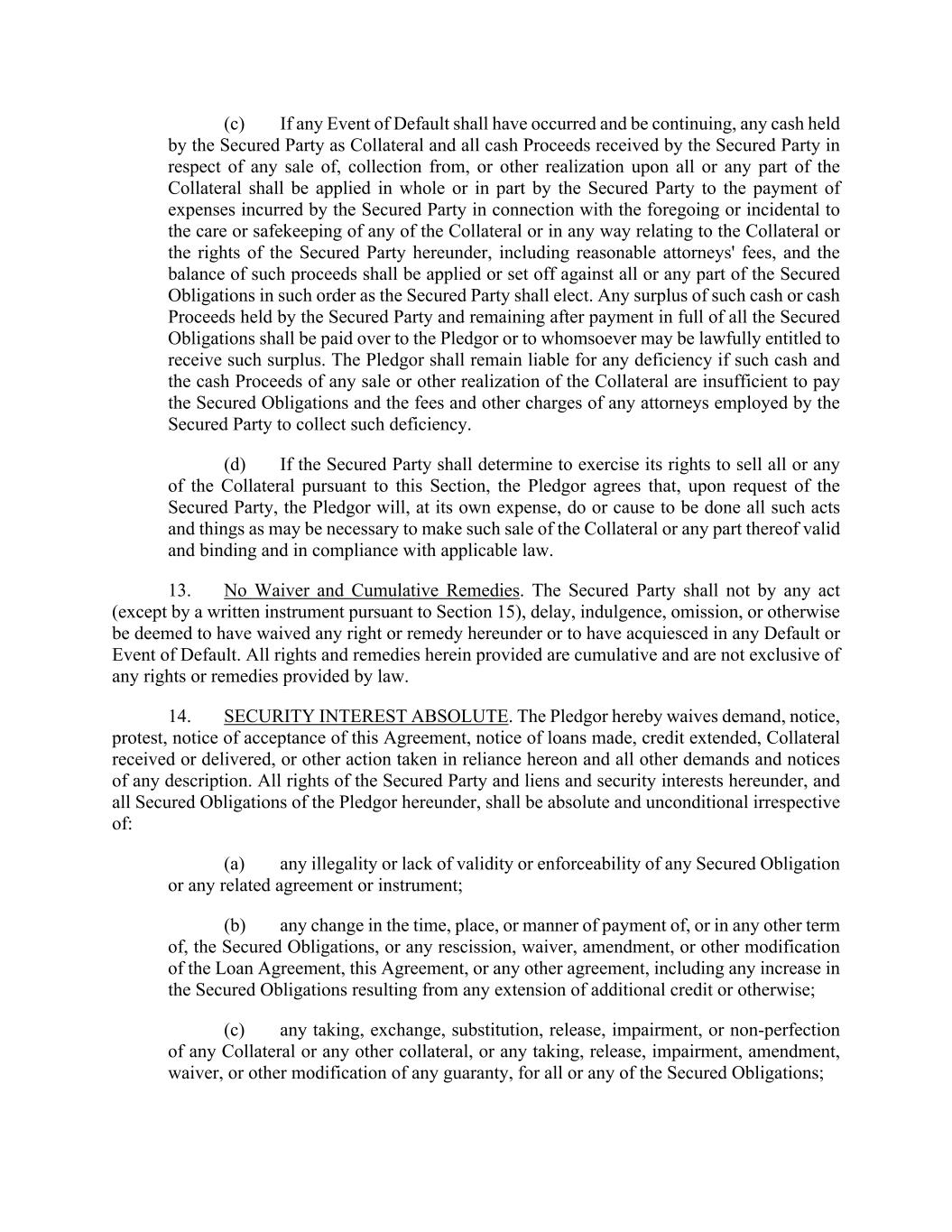 (c) If any Event of Default shall have occurred and be continuing, any cash held by the Secured Party as Collateral and all cash Proceeds received by the Secured Party in respect of any sale of, collection from, or other realization upon all or any part of the Collateral shall be applied in whole or in part by the Secured Party to the payment of expenses incurred by the Secured Party in connection with the foregoing or incidental to the care or safekeeping of any of the Collateral or in any way relating to the Collateral or the rights of the Secured Party hereunder, including reasonable attorneys' fees, and the balance of such proceeds shall be applied or set off against all or any part of the Secured Obligations in such order as the Secured Party shall elect. Any surplus of such cash or cash Proceeds held by the Secured Party and remaining after payment in full of all the Secured Obligations shall be paid over to the Pledgor or to whomsoever may be lawfully entitled to receive such surplus. The Pledgor shall remain liable for any deficiency if such cash and the cash Proceeds of any sale or other realization of the Collateral are insufficient to pay the Secured Obligations and the fees and other charges of any attorneys employed by the Secured Party to collect such deficiency. (d) If the Secured Party shall determine to exercise its rights to sell all or any of the Collateral pursuant to this Section, the Pledgor agrees that, upon request of the Secured Party, the Pledgor will, at its own expense, do or cause to be done all such acts and things as may be necessary to make such sale of the Collateral or any part thereof valid and binding and in compliance with applicable law. 13. No Waiver and Cumulative Remedies. The Secured Party shall not by any act (except by a written instrument pursuant to Section 15), delay, indulgence, omission, or otherwise be deemed to have waived any right or remedy hereunder or to have acquiesced in any Default or Event of Default. All rights and remedies herein provided are cumulative and are not exclusive of any rights or remedies provided by law. 14. SECURITY INTEREST ABSOLUTE. The Pledgor hereby waives demand, notice, protest, notice of acceptance of this Agreement, notice of loans made, credit extended, Collateral received or delivered, or other action taken in reliance hereon and all other demands and notices of any description. All rights of the Secured Party and liens and security interests hereunder, and all Secured Obligations of the Pledgor hereunder, shall be absolute and unconditional irrespective of: (a) any illegality or lack of validity or enforceability of any Secured Obligation or any related agreement or instrument; (b) any change in the time, place, or manner of payment of, or in any other term of, the Secured Obligations, or any rescission, waiver, amendment, or other modification of the Loan Agreement, this Agreement, or any other agreement, including any increase in the Secured Obligations resulting from any extension of additional credit or otherwise; (c) any taking, exchange, substitution, release, impairment, or non-perfection of any Collateral or any other collateral, or any taking, release, impairment, amendment, waiver, or other modification of any guaranty, for all or any of the Secured Obligations;