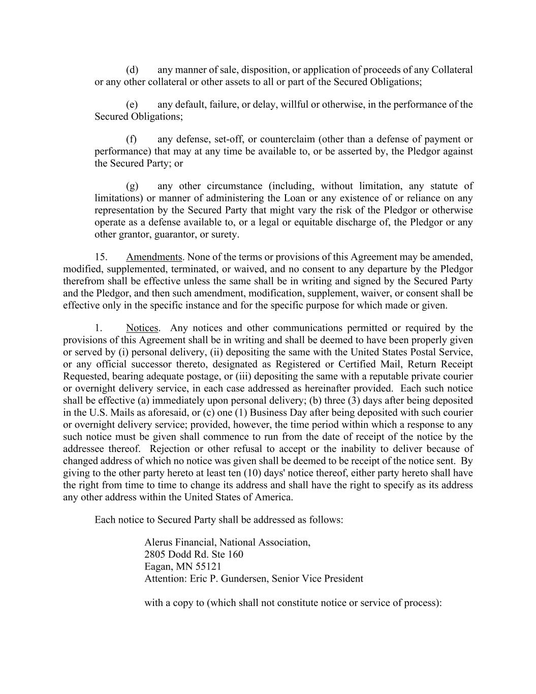 (d) any manner of sale, disposition, or application of proceeds of any Collateral or any other collateral or other assets to all or part of the Secured Obligations; (e) any default, failure, or delay, willful or otherwise, in the performance of the Secured Obligations; (f) any defense, set-off, or counterclaim (other than a defense of payment or performance) that may at any time be available to, or be asserted by, the Pledgor against the Secured Party; or (g) any other circumstance (including, without limitation, any statute of limitations) or manner of administering the Loan or any existence of or reliance on any representation by the Secured Party that might vary the risk of the Pledgor or otherwise operate as a defense available to, or a legal or equitable discharge of, the Pledgor or any other grantor, guarantor, or surety. 15. Amendments. None of the terms or provisions of this Agreement may be amended, modified, supplemented, terminated, or waived, and no consent to any departure by the Pledgor therefrom shall be effective unless the same shall be in writing and signed by the Secured Party and the Pledgor, and then such amendment, modification, supplement, waiver, or consent shall be effective only in the specific instance and for the specific purpose for which made or given. 1. Notices. Any notices and other communications permitted or required by the provisions of this Agreement shall be in writing and shall be deemed to have been properly given or served by (i) personal delivery, (ii) depositing the same with the United States Postal Service, or any official successor thereto, designated as Registered or Certified Mail, Return Receipt Requested, bearing adequate postage, or (iii) depositing the same with a reputable private courier or overnight delivery service, in each case addressed as hereinafter provided. Each such notice shall be effective (a) immediately upon personal delivery; (b) three (3) days after being deposited in the U.S. Mails as aforesaid, or (c) one (1) Business Day after being deposited with such courier or overnight delivery service; provided, however, the time period within which a response to any such notice must be given shall commence to run from the date of receipt of the notice by the addressee thereof. Rejection or other refusal to accept or the inability to deliver because of changed address of which no notice was given shall be deemed to be receipt of the notice sent. By giving to the other party hereto at least ten (10) days' notice thereof, either party hereto shall have the right from time to time to change its address and shall have the right to specify as its address any other address within the United States of America. Each notice to Secured Party shall be addressed as follows: Alerus Financial, National Association, 2805 Dodd Rd. Ste 160 Eagan, MN 55121 Attention: Eric P. Gundersen, Senior Vice President with a copy to (which shall not constitute notice or service of process):