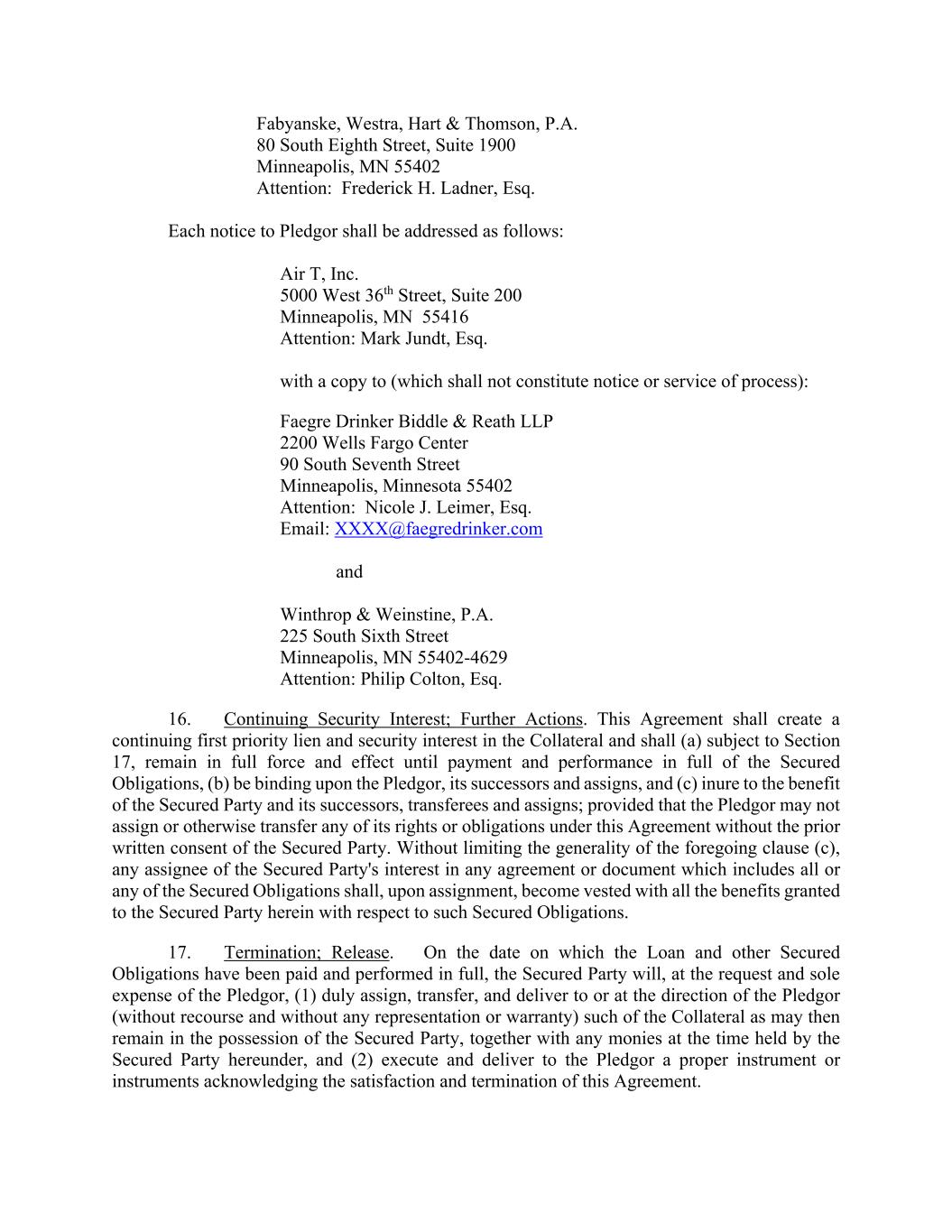 Fabyanske, Westra, Hart & Thomson, P.A. 80 South Eighth Street, Suite 1900 Minneapolis, MN 55402 Attention: Frederick H. Ladner, Esq. Each notice to Pledgor shall be addressed as follows: Air T, Inc. 5000 West 36th Street, Suite 200 Minneapolis, MN 55416 Attention: Mark Jundt, Esq. with a copy to (which shall not constitute notice or service of process): Faegre Drinker Biddle & Reath LLP 2200 Wells Fargo Center 90 South Seventh Street Minneapolis, Minnesota 55402 Attention: Nicole J. Leimer, Esq. Email: XXXX@faegredrinker.com and Winthrop & Weinstine, P.A. 225 South Sixth Street Minneapolis, MN 55402-4629 Attention: Philip Colton, Esq. 16. Continuing Security Interest; Further Actions. This Agreement shall create a continuing first priority lien and security interest in the Collateral and shall (a) subject to Section 17, remain in full force and effect until payment and performance in full of the Secured Obligations, (b) be binding upon the Pledgor, its successors and assigns, and (c) inure to the benefit of the Secured Party and its successors, transferees and assigns; provided that the Pledgor may not assign or otherwise transfer any of its rights or obligations under this Agreement without the prior written consent of the Secured Party. Without limiting the generality of the foregoing clause (c), any assignee of the Secured Party's interest in any agreement or document which includes all or any of the Secured Obligations shall, upon assignment, become vested with all the benefits granted to the Secured Party herein with respect to such Secured Obligations. 17. Termination; Release. On the date on which the Loan and other Secured Obligations have been paid and performed in full, the Secured Party will, at the request and sole expense of the Pledgor, (1) duly assign, transfer, and deliver to or at the direction of the Pledgor (without recourse and without any representation or warranty) such of the Collateral as may then remain in the possession of the Secured Party, together with any monies at the time held by the Secured Party hereunder, and (2) execute and deliver to the Pledgor a proper instrument or instruments acknowledging the satisfaction and termination of this Agreement.
