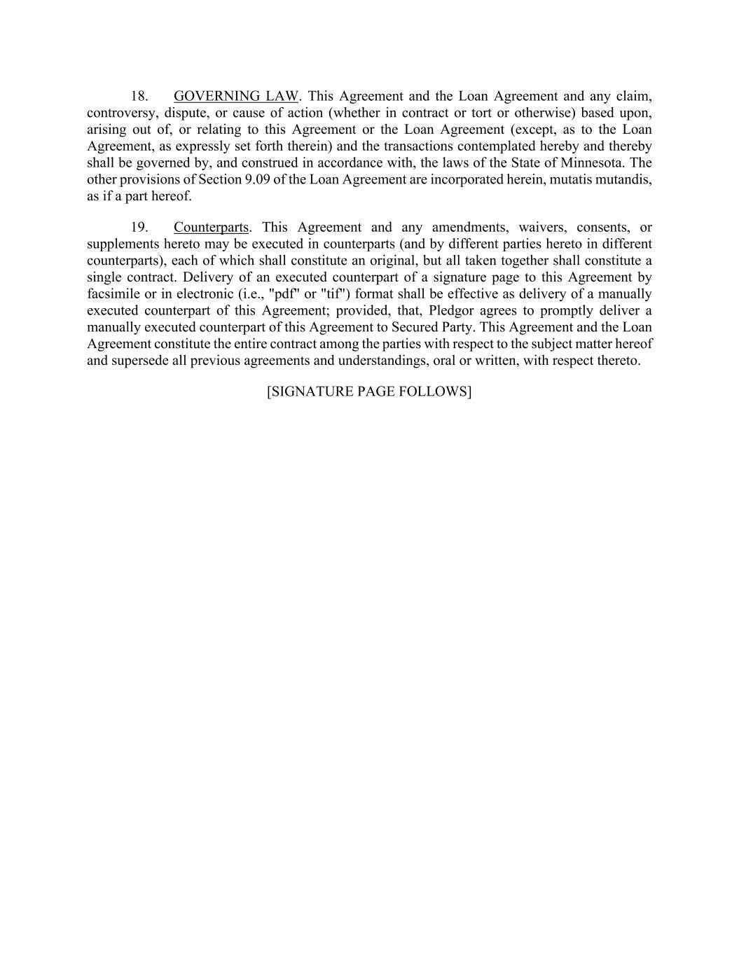 18. GOVERNING LAW. This Agreement and the Loan Agreement and any claim, controversy, dispute, or cause of action (whether in contract or tort or otherwise) based upon, arising out of, or relating to this Agreement or the Loan Agreement (except, as to the Loan Agreement, as expressly set forth therein) and the transactions contemplated hereby and thereby shall be governed by, and construed in accordance with, the laws of the State of Minnesota. The other provisions of Section 9.09 of the Loan Agreement are incorporated herein, mutatis mutandis, as if a part hereof. 19. Counterparts. This Agreement and any amendments, waivers, consents, or supplements hereto may be executed in counterparts (and by different parties hereto in different counterparts), each of which shall constitute an original, but all taken together shall constitute a single contract. Delivery of an executed counterpart of a signature page to this Agreement by facsimile or in electronic (i.e., "pdf" or "tif") format shall be effective as delivery of a manually executed counterpart of this Agreement; provided, that, Pledgor agrees to promptly deliver a manually executed counterpart of this Agreement to Secured Party. This Agreement and the Loan Agreement constitute the entire contract among the parties with respect to the subject matter hereof and supersede all previous agreements and understandings, oral or written, with respect thereto. [SIGNATURE PAGE FOLLOWS]