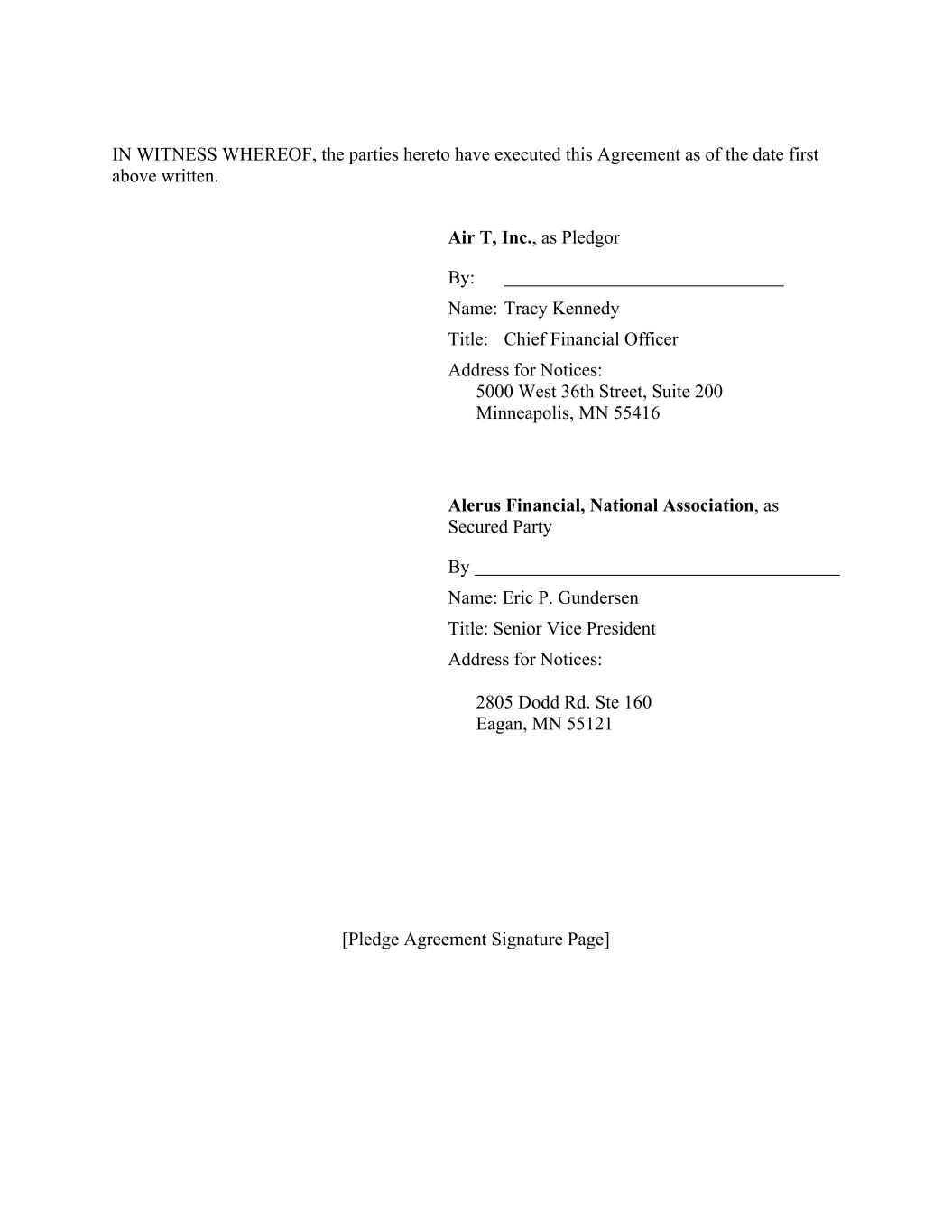 IN WITNESS WHEREOF, the parties hereto have executed this Agreement as of the date first above written. Air T, Inc., as Pledgor By: Name: Tracy Kennedy Title: Chief Financial Officer Address for Notices: 5000 West 36th Street, Suite 200 Minneapolis, MN 55416 Alerus Financial, National Association, as Secured Party By Name: Eric P. Gundersen Title: Senior Vice President Address for Notices: 2805 Dodd Rd. Ste 160 Eagan, MN 55121 [Pledge Agreement Signature Page]