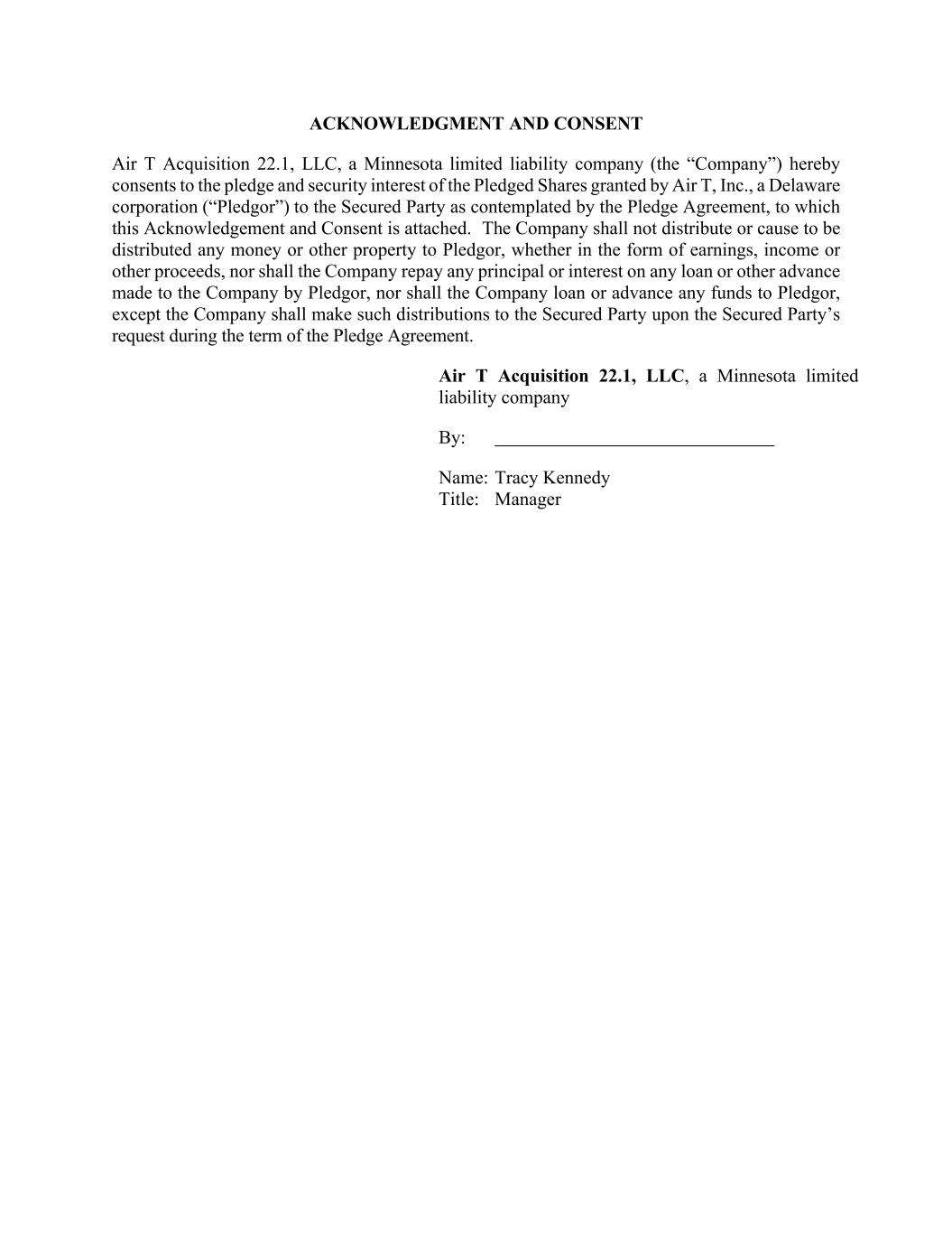 ACKNOWLEDGMENT AND CONSENT Air T Acquisition 22.1, LLC, a Minnesota limited liability company (the “Company”) hereby consents to the pledge and security interest of the Pledged Shares granted by Air T, Inc., a Delaware corporation (“Pledgor”) to the Secured Party as contemplated by the Pledge Agreement, to which this Acknowledgement and Consent is attached. The Company shall not distribute or cause to be distributed any money or other property to Pledgor, whether in the form of earnings, income or other proceeds, nor shall the Company repay any principal or interest on any loan or other advance made to the Company by Pledgor, nor shall the Company loan or advance any funds to Pledgor, except the Company shall make such distributions to the Secured Party upon the Secured Party’s request during the term of the Pledge Agreement. Air T Acquisition 22.1, LLC, a Minnesota limited liability company By: Name: Tracy Kennedy Title: Manager