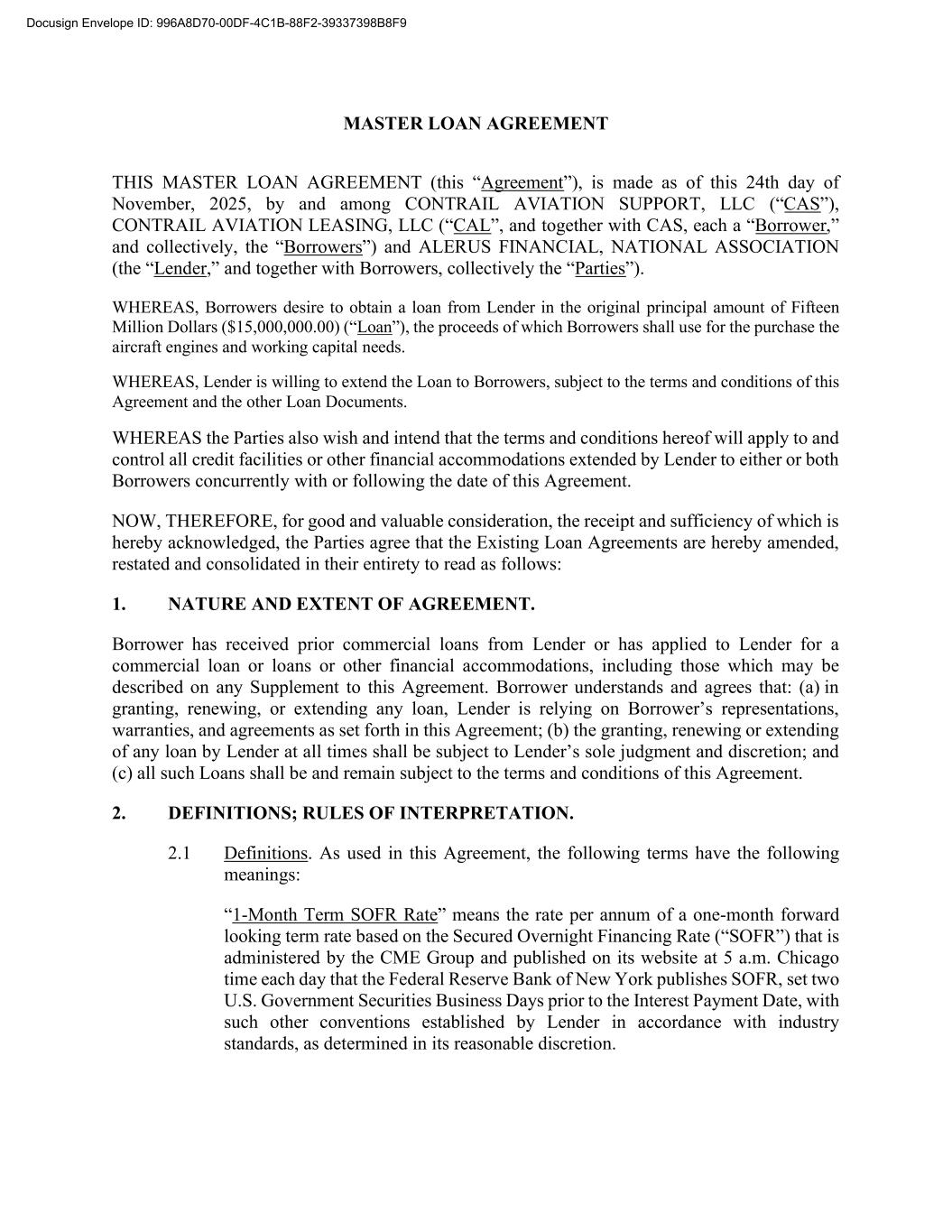 MASTER LOAN AGREEMENT THIS MASTER LOAN AGREEMENT (this “Agreement”), is made as of this 24th day of November, 2025, by and among CONTRAIL AVIATION SUPPORT, LLC (“CAS”), CONTRAIL AVIATION LEASING, LLC (“CAL”, and together with CAS, each a “Borrower,” and collectively, the “Borrowers”) and ALERUS FINANCIAL, NATIONAL ASSOCIATION (the “Lender,” and together with Borrowers, collectively the “Parties”). WHEREAS, Borrowers desire to obtain a loan from Lender in the original principal amount of Fifteen Million Dollars ($15,000,000.00) (“Loan”), the proceeds of which Borrowers shall use for the purchase the aircraft engines and working capital needs. WHEREAS, Lender is willing to extend the Loan to Borrowers, subject to the terms and conditions of this Agreement and the other Loan Documents. WHEREAS the Parties also wish and intend that the terms and conditions hereof will apply to and control all credit facilities or other financial accommodations extended by Lender to either or both Borrowers concurrently with or following the date of this Agreement. NOW, THEREFORE, for good and valuable consideration, the receipt and sufficiency of which is hereby acknowledged, the Parties agree that the Existing Loan Agreements are hereby amended, restated and consolidated in their entirety to read as follows: 1. NATURE AND EXTENT OF AGREEMENT. Borrower has received prior commercial loans from Lender or has applied to Lender for a commercial loan or loans or other financial accommodations, including those which may be described on any Supplement to this Agreement. Borrower understands and agrees that: (a) in granting, renewing, or extending any loan, Lender is relying on Borrower’s representations, warranties, and agreements as set forth in this Agreement; (b) the granting, renewing or extending of any loan by Lender at all times shall be subject to Lender’s sole judgment and discretion; and (c) all such Loans shall be and remain subject to the terms and conditions of this Agreement. 2. DEFINITIONS; RULES OF INTERPRETATION. 2.1 Definitions. As used in this Agreement, the following terms have the following meanings: “1-Month Term SOFR Rate” means the rate per annum of a one-month forward looking term rate based on the Secured Overnight Financing Rate (“SOFR”) that is administered by the CME Group and published on its website at 5 a.m. Chicago time each day that the Federal Reserve Bank of New York publishes SOFR, set two U.S. Government Securities Business Days prior to the Interest Payment Date, with such other conventions established by Lender in accordance with industry standards, as determined in its reasonable discretion. Docusign Envelope ID: 996A8D70-00DF-4C1B-88F2-39337398B8F9