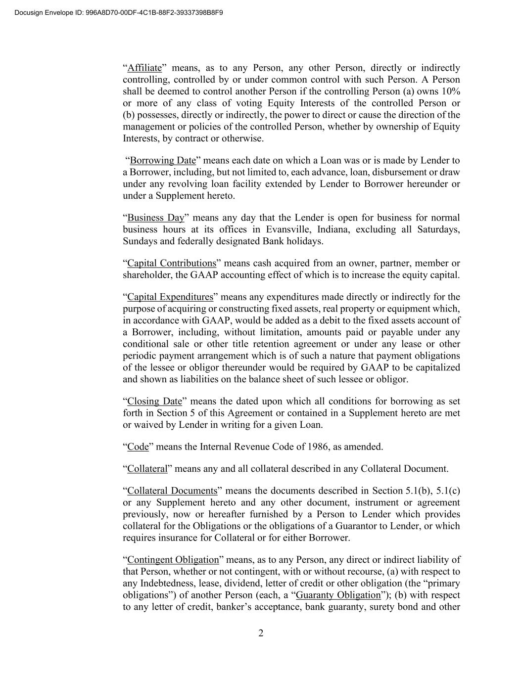 2 “Affiliate” means, as to any Person, any other Person, directly or indirectly controlling, controlled by or under common control with such Person. A Person shall be deemed to control another Person if the controlling Person (a) owns 10% or more of any class of voting Equity Interests of the controlled Person or (b) possesses, directly or indirectly, the power to direct or cause the direction of the management or policies of the controlled Person, whether by ownership of Equity Interests, by contract or otherwise. “Borrowing Date” means each date on which a Loan was or is made by Lender to a Borrower, including, but not limited to, each advance, loan, disbursement or draw under any revolving loan facility extended by Lender to Borrower hereunder or under a Supplement hereto. “Business Day” means any day that the Lender is open for business for normal business hours at its offices in Evansville, Indiana, excluding all Saturdays, Sundays and federally designated Bank holidays. “Capital Contributions” means cash acquired from an owner, partner, member or shareholder, the GAAP accounting effect of which is to increase the equity capital. “Capital Expenditures” means any expenditures made directly or indirectly for the purpose of acquiring or constructing fixed assets, real property or equipment which, in accordance with GAAP, would be added as a debit to the fixed assets account of a Borrower, including, without limitation, amounts paid or payable under any conditional sale or other title retention agreement or under any lease or other periodic payment arrangement which is of such a nature that payment obligations of the lessee or obligor thereunder would be required by GAAP to be capitalized and shown as liabilities on the balance sheet of such lessee or obligor. “Closing Date” means the dated upon which all conditions for borrowing as set forth in Section 5 of this Agreement or contained in a Supplement hereto are met or waived by Lender in writing for a given Loan. “Code” means the Internal Revenue Code of 1986, as amended. “Collateral” means any and all collateral described in any Collateral Document. “Collateral Documents” means the documents described in Section 5.1(b), 5.1(c) or any Supplement hereto and any other document, instrument or agreement previously, now or hereafter furnished by a Person to Lender which provides collateral for the Obligations or the obligations of a Guarantor to Lender, or which requires insurance for Collateral or for either Borrower. “Contingent Obligation” means, as to any Person, any direct or indirect liability of that Person, whether or not contingent, with or without recourse, (a) with respect to any Indebtedness, lease, dividend, letter of credit or other obligation (the “primary obligations”) of another Person (each, a “Guaranty Obligation”); (b) with respect to any letter of credit, banker’s acceptance, bank guaranty, surety bond and other Docusign Envelope ID: 996A8D70-00DF-4C1B-88F2-39337398B8F9