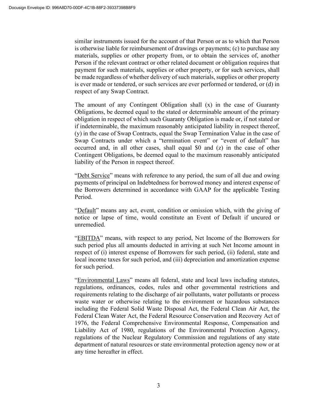 3 similar instruments issued for the account of that Person or as to which that Person is otherwise liable for reimbursement of drawings or payments; (c) to purchase any materials, supplies or other property from, or to obtain the services of, another Person if the relevant contract or other related document or obligation requires that payment for such materials, supplies or other property, or for such services, shall be made regardless of whether delivery of such materials, supplies or other property is ever made or tendered, or such services are ever performed or tendered, or (d) in respect of any Swap Contract. The amount of any Contingent Obligation shall (x) in the case of Guaranty Obligations, be deemed equal to the stated or determinable amount of the primary obligation in respect of which such Guaranty Obligation is made or, if not stated or if indeterminable, the maximum reasonably anticipated liability in respect thereof, (y) in the case of Swap Contracts, equal the Swap Termination Value in the case of Swap Contracts under which a “termination event” or “event of default” has occurred and, in all other cases, shall equal $0 and (z) in the case of other Contingent Obligations, be deemed equal to the maximum reasonably anticipated liability of the Person in respect thereof. “Debt Service” means with reference to any period, the sum of all due and owing payments of principal on Indebtedness for borrowed money and interest expense of the Borrowers determined in accordance with GAAP for the applicable Testing Period. “Default” means any act, event, condition or omission which, with the giving of notice or lapse of time, would constitute an Event of Default if uncured or unremedied. “EBITDA” means, with respect to any period, Net Income of the Borrowers for such period plus all amounts deducted in arriving at such Net Income amount in respect of (i) interest expense of Borrowers for such period, (ii) federal, state and local income taxes for such period, and (iii) depreciation and amortization expense for such period. “Environmental Laws” means all federal, state and local laws including statutes, regulations, ordinances, codes, rules and other governmental restrictions and requirements relating to the discharge of air pollutants, water pollutants or process waste water or otherwise relating to the environment or hazardous substances including the Federal Solid Waste Disposal Act, the Federal Clean Air Act, the Federal Clean Water Act, the Federal Resource Conservation and Recovery Act of 1976, the Federal Comprehensive Environmental Response, Compensation and Liability Act of 1980, regulations of the Environmental Protection Agency, regulations of the Nuclear Regulatory Commission and regulations of any state department of natural resources or state environmental protection agency now or at any time hereafter in effect. Docusign Envelope ID: 996A8D70-00DF-4C1B-88F2-39337398B8F9