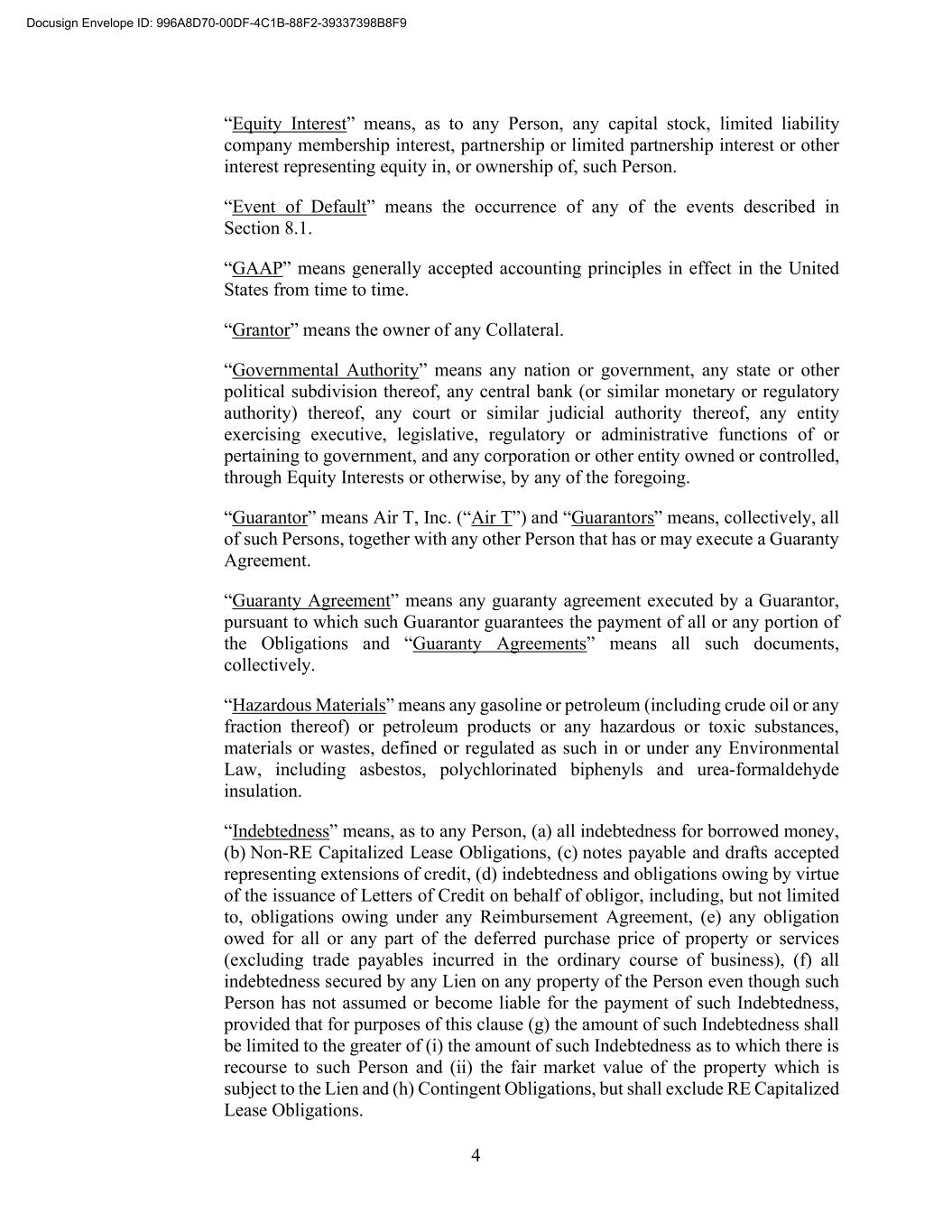 4 “Equity Interest” means, as to any Person, any capital stock, limited liability company membership interest, partnership or limited partnership interest or other interest representing equity in, or ownership of, such Person. “Event of Default” means the occurrence of any of the events described in Section 8.1. “GAAP” means generally accepted accounting principles in effect in the United States from time to time. “Grantor” means the owner of any Collateral. “Governmental Authority” means any nation or government, any state or other political subdivision thereof, any central bank (or similar monetary or regulatory authority) thereof, any court or similar judicial authority thereof, any entity exercising executive, legislative, regulatory or administrative functions of or pertaining to government, and any corporation or other entity owned or controlled, through Equity Interests or otherwise, by any of the foregoing. “Guarantor” means Air T, Inc. (“Air T”) and “Guarantors” means, collectively, all of such Persons, together with any other Person that has or may execute a Guaranty Agreement. “Guaranty Agreement” means any guaranty agreement executed by a Guarantor, pursuant to which such Guarantor guarantees the payment of all or any portion of the Obligations and “Guaranty Agreements” means all such documents, collectively. “Hazardous Materials” means any gasoline or petroleum (including crude oil or any fraction thereof) or petroleum products or any hazardous or toxic substances, materials or wastes, defined or regulated as such in or under any Environmental Law, including asbestos, polychlorinated biphenyls and urea-formaldehyde insulation. “Indebtedness” means, as to any Person, (a) all indebtedness for borrowed money, (b) Non-RE Capitalized Lease Obligations, (c) notes payable and drafts accepted representing extensions of credit, (d) indebtedness and obligations owing by virtue of the issuance of Letters of Credit on behalf of obligor, including, but not limited to, obligations owing under any Reimbursement Agreement, (e) any obligation owed for all or any part of the deferred purchase price of property or services (excluding trade payables incurred in the ordinary course of business), (f) all indebtedness secured by any Lien on any property of the Person even though such Person has not assumed or become liable for the payment of such Indebtedness, provided that for purposes of this clause (g) the amount of such Indebtedness shall be limited to the greater of (i) the amount of such Indebtedness as to which there is recourse to such Person and (ii) the fair market value of the property which is subject to the Lien and (h) Contingent Obligations, but shall exclude RE Capitalized Lease Obligations. Docusign Envelope ID: 996A8D70-00DF-4C1B-88F2-39337398B8F9