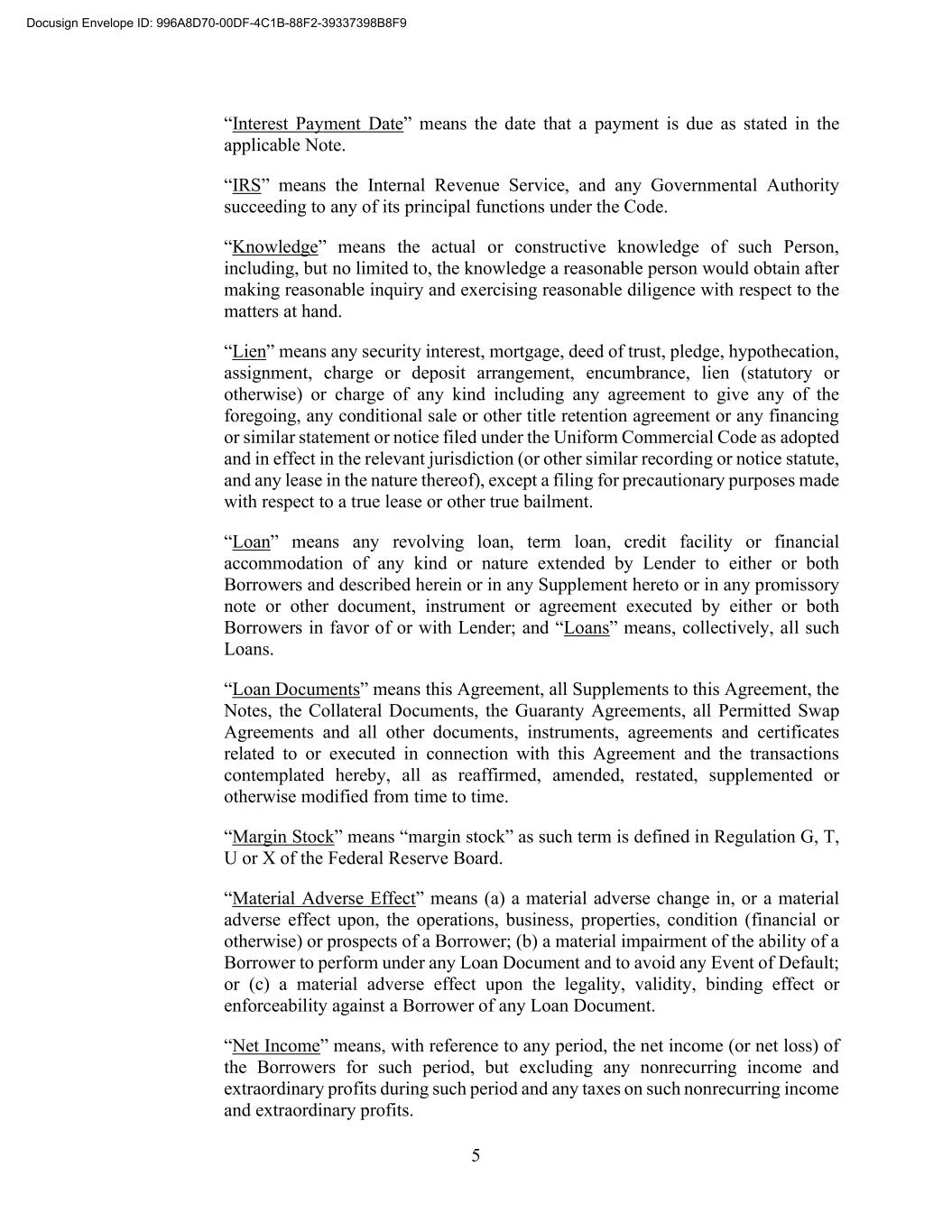 5 “Interest Payment Date” means the date that a payment is due as stated in the applicable Note. “IRS” means the Internal Revenue Service, and any Governmental Authority succeeding to any of its principal functions under the Code. “Knowledge” means the actual or constructive knowledge of such Person, including, but no limited to, the knowledge a reasonable person would obtain after making reasonable inquiry and exercising reasonable diligence with respect to the matters at hand. “Lien” means any security interest, mortgage, deed of trust, pledge, hypothecation, assignment, charge or deposit arrangement, encumbrance, lien (statutory or otherwise) or charge of any kind including any agreement to give any of the foregoing, any conditional sale or other title retention agreement or any financing or similar statement or notice filed under the Uniform Commercial Code as adopted and in effect in the relevant jurisdiction (or other similar recording or notice statute, and any lease in the nature thereof), except a filing for precautionary purposes made with respect to a true lease or other true bailment. “Loan” means any revolving loan, term loan, credit facility or financial accommodation of any kind or nature extended by Lender to either or both Borrowers and described herein or in any Supplement hereto or in any promissory note or other document, instrument or agreement executed by either or both Borrowers in favor of or with Lender; and “Loans” means, collectively, all such Loans. “Loan Documents” means this Agreement, all Supplements to this Agreement, the Notes, the Collateral Documents, the Guaranty Agreements, all Permitted Swap Agreements and all other documents, instruments, agreements and certificates related to or executed in connection with this Agreement and the transactions contemplated hereby, all as reaffirmed, amended, restated, supplemented or otherwise modified from time to time. “Margin Stock” means “margin stock” as such term is defined in Regulation G, T, U or X of the Federal Reserve Board. “Material Adverse Effect” means (a) a material adverse change in, or a material adverse effect upon, the operations, business, properties, condition (financial or otherwise) or prospects of a Borrower; (b) a material impairment of the ability of a Borrower to perform under any Loan Document and to avoid any Event of Default; or (c) a material adverse effect upon the legality, validity, binding effect or enforceability against a Borrower of any Loan Document. “Net Income” means, with reference to any period, the net income (or net loss) of the Borrowers for such period, but excluding any nonrecurring income and extraordinary profits during such period and any taxes on such nonrecurring income and extraordinary profits. Docusign Envelope ID: 996A8D70-00DF-4C1B-88F2-39337398B8F9