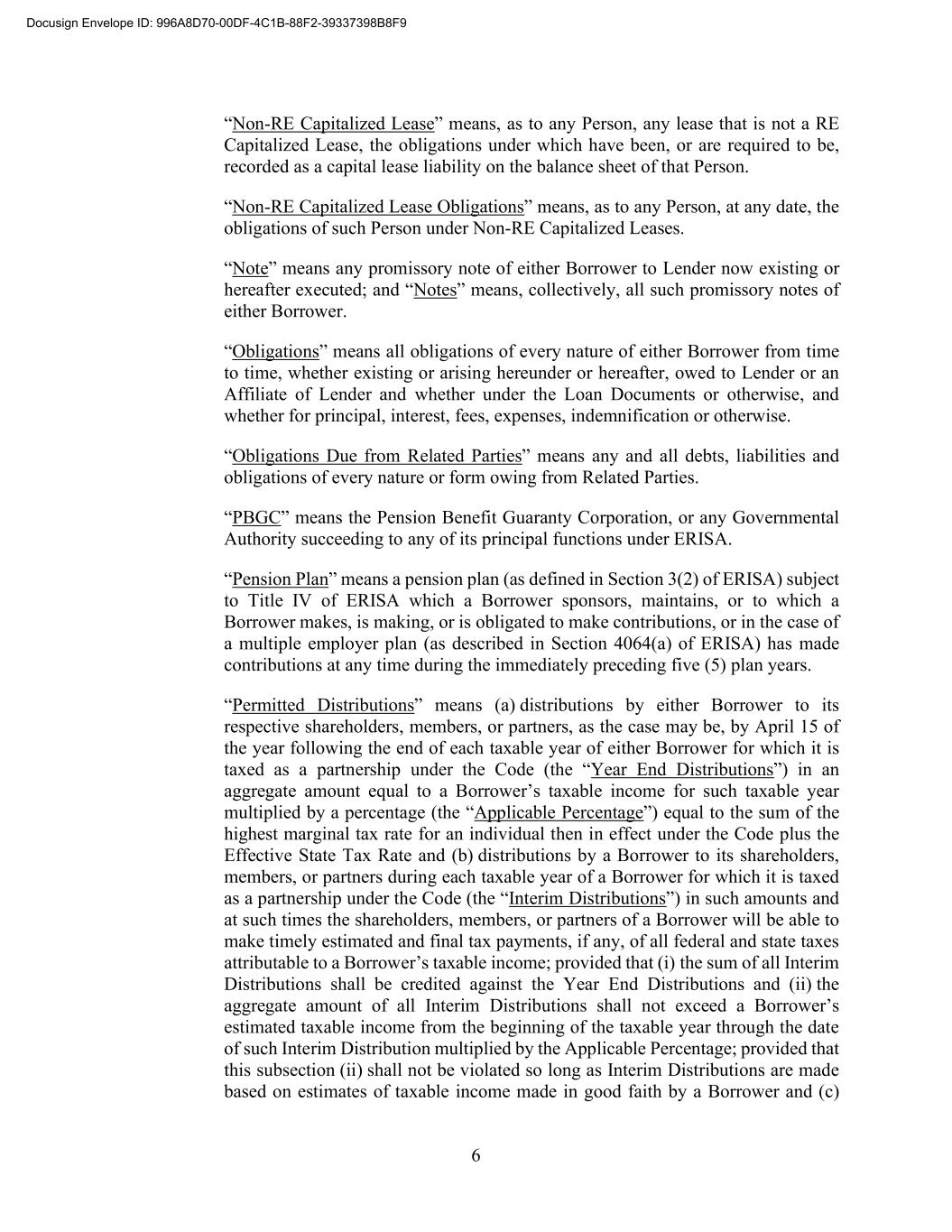 6 “Non-RE Capitalized Lease” means, as to any Person, any lease that is not a RE Capitalized Lease, the obligations under which have been, or are required to be, recorded as a capital lease liability on the balance sheet of that Person. “Non-RE Capitalized Lease Obligations” means, as to any Person, at any date, the obligations of such Person under Non-RE Capitalized Leases. “Note” means any promissory note of either Borrower to Lender now existing or hereafter executed; and “Notes” means, collectively, all such promissory notes of either Borrower. “Obligations” means all obligations of every nature of either Borrower from time to time, whether existing or arising hereunder or hereafter, owed to Lender or an Affiliate of Lender and whether under the Loan Documents or otherwise, and whether for principal, interest, fees, expenses, indemnification or otherwise. “Obligations Due from Related Parties” means any and all debts, liabilities and obligations of every nature or form owing from Related Parties. “PBGC” means the Pension Benefit Guaranty Corporation, or any Governmental Authority succeeding to any of its principal functions under ERISA. “Pension Plan” means a pension plan (as defined in Section 3(2) of ERISA) subject to Title IV of ERISA which a Borrower sponsors, maintains, or to which a Borrower makes, is making, or is obligated to make contributions, or in the case of a multiple employer plan (as described in Section 4064(a) of ERISA) has made contributions at any time during the immediately preceding five (5) plan years. “Permitted Distributions” means (a) distributions by either Borrower to its respective shareholders, members, or partners, as the case may be, by April 15 of the year following the end of each taxable year of either Borrower for which it is taxed as a partnership under the Code (the “Year End Distributions”) in an aggregate amount equal to a Borrower’s taxable income for such taxable year multiplied by a percentage (the “Applicable Percentage”) equal to the sum of the highest marginal tax rate for an individual then in effect under the Code plus the Effective State Tax Rate and (b) distributions by a Borrower to its shareholders, members, or partners during each taxable year of a Borrower for which it is taxed as a partnership under the Code (the “Interim Distributions”) in such amounts and at such times the shareholders, members, or partners of a Borrower will be able to make timely estimated and final tax payments, if any, of all federal and state taxes attributable to a Borrower’s taxable income; provided that (i) the sum of all Interim Distributions shall be credited against the Year End Distributions and (ii) the aggregate amount of all Interim Distributions shall not exceed a Borrower’s estimated taxable income from the beginning of the taxable year through the date of such Interim Distribution multiplied by the Applicable Percentage; provided that this subsection (ii) shall not be violated so long as Interim Distributions are made based on estimates of taxable income made in good faith by a Borrower and (c) Docusign Envelope ID: 996A8D70-00DF-4C1B-88F2-39337398B8F9