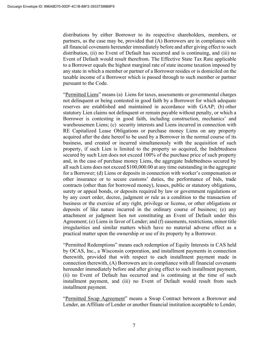 7 distributions by either Borrower to its respective shareholders, members, or partners, as the case may be, provided that (A) Borrowers are in compliance with all financial covenants hereunder immediately before and after giving effect to such distribution, (ii) no Event of Default has occurred and is continuing, and (iii) no Event of Default would result therefrom. The Effective State Tax Rate applicable to a Borrower equals the highest marginal rate of state income taxation imposed by any state in which a member or partner of a Borrower resides or is domiciled on the taxable income of a Borrower which is passed through to such member or partner pursuant to the Code. “Permitted Liens” means (a) Liens for taxes, assessments or governmental charges not delinquent or being contested in good faith by a Borrower for which adequate reserves are established and maintained in accordance with GAAP; (b) other statutory Lien claims not delinquent or remain payable without penalty, or which a Borrower is contesting in good faith, including construction, mechanics’ and warehousemen Liens; (c) security interests and Liens incurred in connection with RE Capitalized Lease Obligations or purchase money Liens on any property acquired after the date hereof to be used by a Borrower in the normal course of its business, and created or incurred simultaneously with the acquisition of such property, if such Lien is limited to the property so acquired, the Indebtedness secured by such Lien does not exceed 100% of the purchase price of such property and, in the case of purchase money Liens, the aggregate Indebtedness secured by all such Liens does not exceed $100,000.00 at any time outstanding in the aggregate for a Borrower; (d) Liens or deposits in connection with worker’s compensation or other insurance or to secure customs’ duties, the performance of bids, trade contracts (other than for borrowed money), leases, public or statutory obligations, surety or appeal bonds, or deposits required by law or government regulations or by any court order, decree, judgment or rule as a condition to the transaction of business or the exercise of any right, privilege or license, or other obligations or deposits of like nature incurred in the ordinary course of business; (e) any attachment or judgment lien not constituting an Event of Default under this Agreement; (e) Liens in favor of Lender; and (f) easements, restrictions, minor title irregularities and similar matters which have no material adverse effect as a practical matter upon the ownership or use of its property by a Borrower. “Permitted Redemptions” means each redemption of Equity Interests in CAS held by OCAS, Inc., a Wisconsin corporation, and installment payments in connection therewith, provided that with respect to each installment payment made in connection therewith, (A) Borrowers are in compliance with all financial covenants hereunder immediately before and after giving effect to such installment payment, (ii) no Event of Default has occurred and is continuing at the time of such installment payment, and (iii) no Event of Default would result from such installment payment. “Permitted Swap Agreement” means a Swap Contract between a Borrower and Lender, an Affiliate of Lender or another financial institution acceptable to Lender, Docusign Envelope ID: 996A8D70-00DF-4C1B-88F2-39337398B8F9