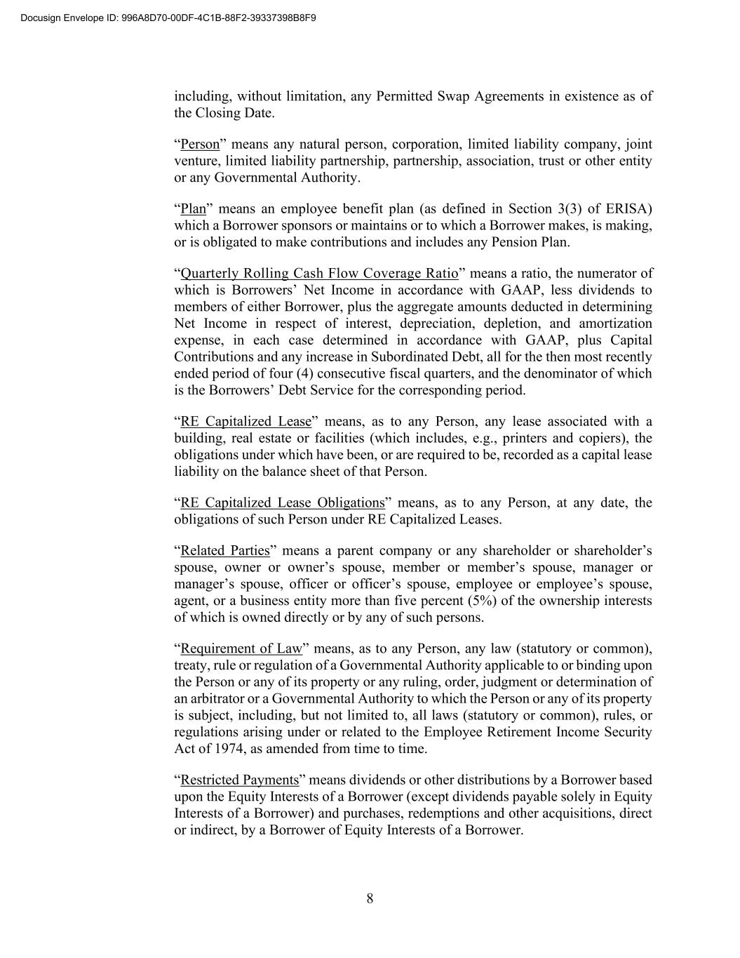 8 including, without limitation, any Permitted Swap Agreements in existence as of the Closing Date. “Person” means any natural person, corporation, limited liability company, joint venture, limited liability partnership, partnership, association, trust or other entity or any Governmental Authority. “Plan” means an employee benefit plan (as defined in Section 3(3) of ERISA) which a Borrower sponsors or maintains or to which a Borrower makes, is making, or is obligated to make contributions and includes any Pension Plan. “Quarterly Rolling Cash Flow Coverage Ratio” means a ratio, the numerator of which is Borrowers’ Net Income in accordance with GAAP, less dividends to members of either Borrower, plus the aggregate amounts deducted in determining Net Income in respect of interest, depreciation, depletion, and amortization expense, in each case determined in accordance with GAAP, plus Capital Contributions and any increase in Subordinated Debt, all for the then most recently ended period of four (4) consecutive fiscal quarters, and the denominator of which is the Borrowers’ Debt Service for the corresponding period. “RE Capitalized Lease” means, as to any Person, any lease associated with a building, real estate or facilities (which includes, e.g., printers and copiers), the obligations under which have been, or are required to be, recorded as a capital lease liability on the balance sheet of that Person. “RE Capitalized Lease Obligations” means, as to any Person, at any date, the obligations of such Person under RE Capitalized Leases. “Related Parties” means a parent company or any shareholder or shareholder’s spouse, owner or owner’s spouse, member or member’s spouse, manager or manager’s spouse, officer or officer’s spouse, employee or employee’s spouse, agent, or a business entity more than five percent (5%) of the ownership interests of which is owned directly or by any of such persons. “Requirement of Law” means, as to any Person, any law (statutory or common), treaty, rule or regulation of a Governmental Authority applicable to or binding upon the Person or any of its property or any ruling, order, judgment or determination of an arbitrator or a Governmental Authority to which the Person or any of its property is subject, including, but not limited to, all laws (statutory or common), rules, or regulations arising under or related to the Employee Retirement Income Security Act of 1974, as amended from time to time. “Restricted Payments” means dividends or other distributions by a Borrower based upon the Equity Interests of a Borrower (except dividends payable solely in Equity Interests of a Borrower) and purchases, redemptions and other acquisitions, direct or indirect, by a Borrower of Equity Interests of a Borrower. Docusign Envelope ID: 996A8D70-00DF-4C1B-88F2-39337398B8F9