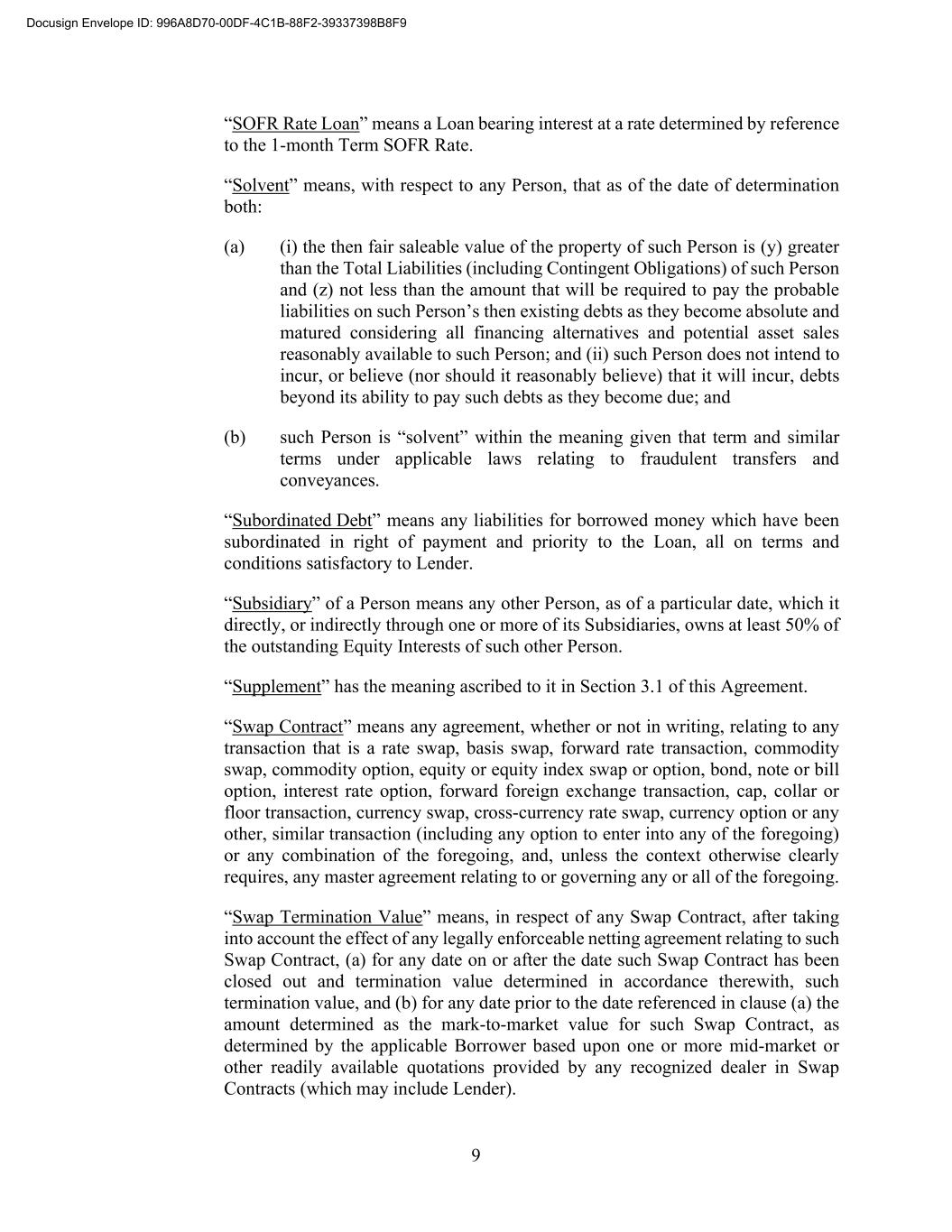 9 “SOFR Rate Loan” means a Loan bearing interest at a rate determined by reference to the 1-month Term SOFR Rate. “Solvent” means, with respect to any Person, that as of the date of determination both: (a) (i) the then fair saleable value of the property of such Person is (y) greater than the Total Liabilities (including Contingent Obligations) of such Person and (z) not less than the amount that will be required to pay the probable liabilities on such Person’s then existing debts as they become absolute and matured considering all financing alternatives and potential asset sales reasonably available to such Person; and (ii) such Person does not intend to incur, or believe (nor should it reasonably believe) that it will incur, debts beyond its ability to pay such debts as they become due; and (b) such Person is “solvent” within the meaning given that term and similar terms under applicable laws relating to fraudulent transfers and conveyances. “Subordinated Debt” means any liabilities for borrowed money which have been subordinated in right of payment and priority to the Loan, all on terms and conditions satisfactory to Lender. “Subsidiary” of a Person means any other Person, as of a particular date, which it directly, or indirectly through one or more of its Subsidiaries, owns at least 50% of the outstanding Equity Interests of such other Person. “Supplement” has the meaning ascribed to it in Section 3.1 of this Agreement. “Swap Contract” means any agreement, whether or not in writing, relating to any transaction that is a rate swap, basis swap, forward rate transaction, commodity swap, commodity option, equity or equity index swap or option, bond, note or bill option, interest rate option, forward foreign exchange transaction, cap, collar or floor transaction, currency swap, cross-currency rate swap, currency option or any other, similar transaction (including any option to enter into any of the foregoing) or any combination of the foregoing, and, unless the context otherwise clearly requires, any master agreement relating to or governing any or all of the foregoing. “Swap Termination Value” means, in respect of any Swap Contract, after taking into account the effect of any legally enforceable netting agreement relating to such Swap Contract, (a) for any date on or after the date such Swap Contract has been closed out and termination value determined in accordance therewith, such termination value, and (b) for any date prior to the date referenced in clause (a) the amount determined as the mark-to-market value for such Swap Contract, as determined by the applicable Borrower based upon one or more mid-market or other readily available quotations provided by any recognized dealer in Swap Contracts (which may include Lender). Docusign Envelope ID: 996A8D70-00DF-4C1B-88F2-39337398B8F9