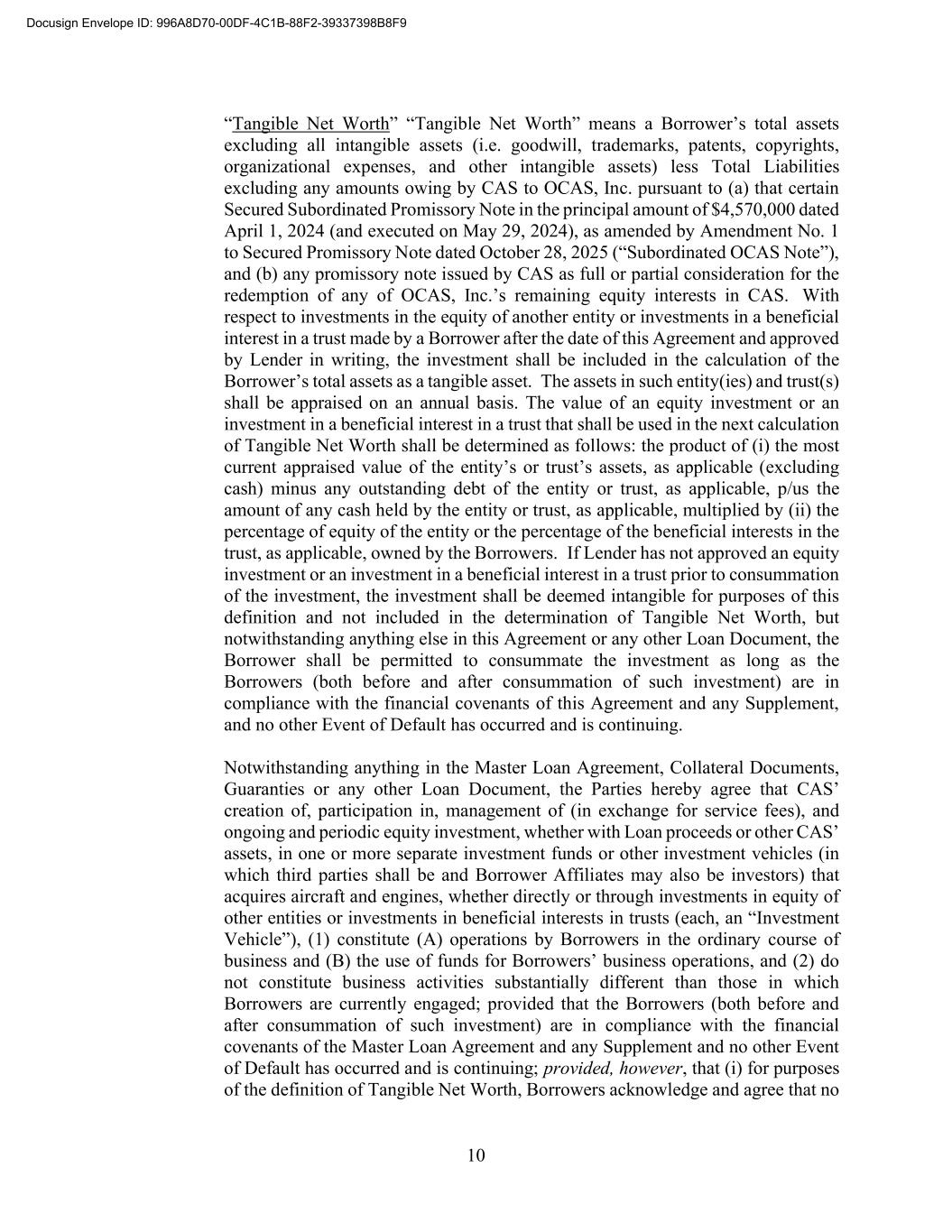 10 “Tangible Net Worth” “Tangible Net Worth” means a Borrower’s total assets excluding all intangible assets (i.e. goodwill, trademarks, patents, copyrights, organizational expenses, and other intangible assets) less Total Liabilities excluding any amounts owing by CAS to OCAS, Inc. pursuant to (a) that certain Secured Subordinated Promissory Note in the principal amount of $4,570,000 dated April 1, 2024 (and executed on May 29, 2024), as amended by Amendment No. 1 to Secured Promissory Note dated October 28, 2025 (“Subordinated OCAS Note”), and (b) any promissory note issued by CAS as full or partial consideration for the redemption of any of OCAS, Inc.’s remaining equity interests in CAS. With respect to investments in the equity of another entity or investments in a beneficial interest in a trust made by a Borrower after the date of this Agreement and approved by Lender in writing, the investment shall be included in the calculation of the Borrower’s total assets as a tangible asset. The assets in such entity(ies) and trust(s) shall be appraised on an annual basis. The value of an equity investment or an investment in a beneficial interest in a trust that shall be used in the next calculation of Tangible Net Worth shall be determined as follows: the product of (i) the most current appraised value of the entity’s or trust’s assets, as applicable (excluding cash) minus any outstanding debt of the entity or trust, as applicable, p/us the amount of any cash held by the entity or trust, as applicable, multiplied by (ii) the percentage of equity of the entity or the percentage of the beneficial interests in the trust, as applicable, owned by the Borrowers. If Lender has not approved an equity investment or an investment in a beneficial interest in a trust prior to consummation of the investment, the investment shall be deemed intangible for purposes of this definition and not included in the determination of Tangible Net Worth, but notwithstanding anything else in this Agreement or any other Loan Document, the Borrower shall be permitted to consummate the investment as long as the Borrowers (both before and after consummation of such investment) are in compliance with the financial covenants of this Agreement and any Supplement, and no other Event of Default has occurred and is continuing. Notwithstanding anything in the Master Loan Agreement, Collateral Documents, Guaranties or any other Loan Document, the Parties hereby agree that CAS’ creation of, participation in, management of (in exchange for service fees), and ongoing and periodic equity investment, whether with Loan proceeds or other CAS’ assets, in one or more separate investment funds or other investment vehicles (in which third parties shall be and Borrower Affiliates may also be investors) that acquires aircraft and engines, whether directly or through investments in equity of other entities or investments in beneficial interests in trusts (each, an “Investment Vehicle”), (1) constitute (A) operations by Borrowers in the ordinary course of business and (B) the use of funds for Borrowers’ business operations, and (2) do not constitute business activities substantially different than those in which Borrowers are currently engaged; provided that the Borrowers (both before and after consummation of such investment) are in compliance with the financial covenants of the Master Loan Agreement and any Supplement and no other Event of Default has occurred and is continuing; provided, however, that (i) for purposes of the definition of Tangible Net Worth, Borrowers acknowledge and agree that no Docusign Envelope ID: 996A8D70-00DF-4C1B-88F2-39337398B8F9