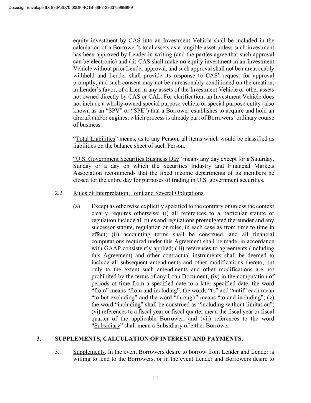 11 equity investment by CAS into an Investment Vehicle shall be included in the calculation of a Borrower’s total assets as a tangible asset unless such investment has been approved by Lender in writing (and the parties agree that such approval can be electronic) and (ii) CAS shall make no equity investment in an Investment Vehicle without prior Lender approval, and such approval shall not be unreasonably withheld and Lender shall provide its response to CAS’ request for approval promptly; and such consent may not be unreasonably conditioned on the creation, in Lender’s favor, of a Lien in any assets of the Investment Vehicle or other assets not owned directly by CAS or CAL. For clarification, an Investment Vehicle does not include a wholly-owned special purpose vehicle or special purpose entity (also known as an “SPV” or “SPE”) that a Borrower establishes to acquire and hold an aircraft and/or engines, which process is already part of Borrowers’ ordinary course of business. “Total Liabilities” means, as to any Person, all items which would be classified as liabilities on the balance sheet of such Person. “U.S. Government Securities Business Day” means any day except for a Saturday, Sunday or a day on which the Securities Industry and Financial Markets Association recommends that the fixed income departments of its members be closed for the entire day for purposes of trading in U.S. government securities. 2.2 Rules of Interpretation; Joint and Several Obligations. (a) Except as otherwise explicitly specified to the contrary or unless the context clearly requires otherwise: (i) all references to a particular statute or regulation include all rules and regulations promulgated thereunder and any successor statute, regulation or rules, in each case as from time to time in effect; (ii) accounting terms shall be construed, and all financial computations required under this Agreement shall be made, in accordance with GAAP consistently applied; (iii) references to agreements (including this Agreement) and other contractual instruments shall be deemed to include all subsequent amendments and other modifications thereto, but only to the extent such amendments and other modifications are not prohibited by the terms of any Loan Document; (iv) in the computation of periods of time from a specified date to a later specified date, the word “from” means “from and including”, the words “to” and “until” each mean “to but excluding” and the word “through” means “to and including”; (v) the word “including” shall be construed as “including without limitation”; (vi) references to a fiscal year or fiscal quarter mean the fiscal year or fiscal quarter of the applicable Borrower; and (vii) references to the word “Subsidiary” shall mean a Subsidiary of either Borrower. 3. SUPPLEMENTS, CALCULATION OF INTEREST AND PAYMENTS. 3.1 Supplements. In the event Borrowers desire to borrow from Lender and Lender is willing to lend to the Borrowers, or in the event Lender and Borrowers desire to Docusign Envelope ID: 996A8D70-00DF-4C1B-88F2-39337398B8F9