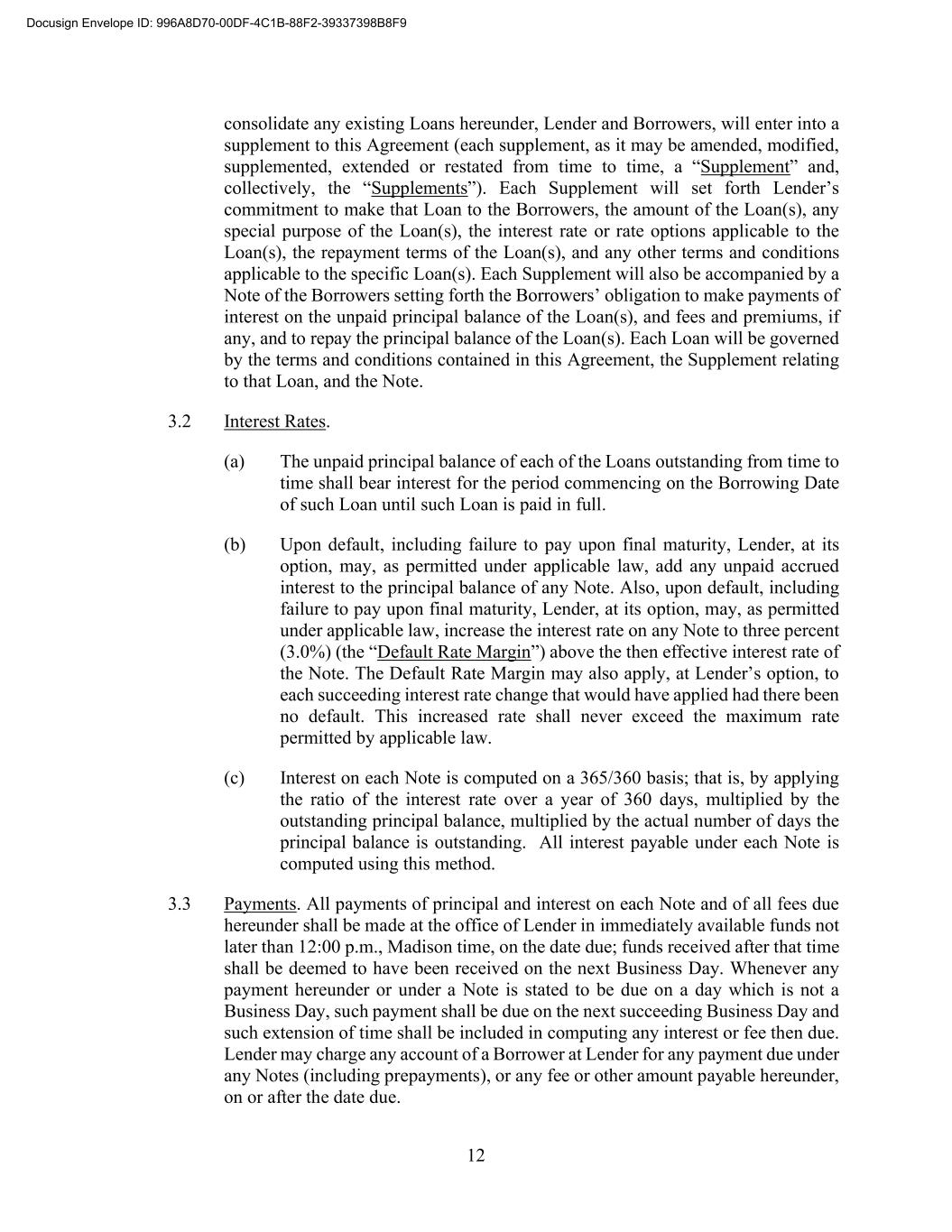 12 consolidate any existing Loans hereunder, Lender and Borrowers, will enter into a supplement to this Agreement (each supplement, as it may be amended, modified, supplemented, extended or restated from time to time, a “Supplement” and, collectively, the “Supplements”). Each Supplement will set forth Lender’s commitment to make that Loan to the Borrowers, the amount of the Loan(s), any special purpose of the Loan(s), the interest rate or rate options applicable to the Loan(s), the repayment terms of the Loan(s), and any other terms and conditions applicable to the specific Loan(s). Each Supplement will also be accompanied by a Note of the Borrowers setting forth the Borrowers’ obligation to make payments of interest on the unpaid principal balance of the Loan(s), and fees and premiums, if any, and to repay the principal balance of the Loan(s). Each Loan will be governed by the terms and conditions contained in this Agreement, the Supplement relating to that Loan, and the Note. 3.2 Interest Rates. (a) The unpaid principal balance of each of the Loans outstanding from time to time shall bear interest for the period commencing on the Borrowing Date of such Loan until such Loan is paid in full. (b) Upon default, including failure to pay upon final maturity, Lender, at its option, may, as permitted under applicable law, add any unpaid accrued interest to the principal balance of any Note. Also, upon default, including failure to pay upon final maturity, Lender, at its option, may, as permitted under applicable law, increase the interest rate on any Note to three percent (3.0%) (the “Default Rate Margin”) above the then effective interest rate of the Note. The Default Rate Margin may also apply, at Lender’s option, to each succeeding interest rate change that would have applied had there been no default. This increased rate shall never exceed the maximum rate permitted by applicable law. (c) Interest on each Note is computed on a 365/360 basis; that is, by applying the ratio of the interest rate over a year of 360 days, multiplied by the outstanding principal balance, multiplied by the actual number of days the principal balance is outstanding. All interest payable under each Note is computed using this method. 3.3 Payments. All payments of principal and interest on each Note and of all fees due hereunder shall be made at the office of Lender in immediately available funds not later than 12:00 p.m., Madison time, on the date due; funds received after that time shall be deemed to have been received on the next Business Day. Whenever any payment hereunder or under a Note is stated to be due on a day which is not a Business Day, such payment shall be due on the next succeeding Business Day and such extension of time shall be included in computing any interest or fee then due. Lender may charge any account of a Borrower at Lender for any payment due under any Notes (including prepayments), or any fee or other amount payable hereunder, on or after the date due. Docusign Envelope ID: 996A8D70-00DF-4C1B-88F2-39337398B8F9