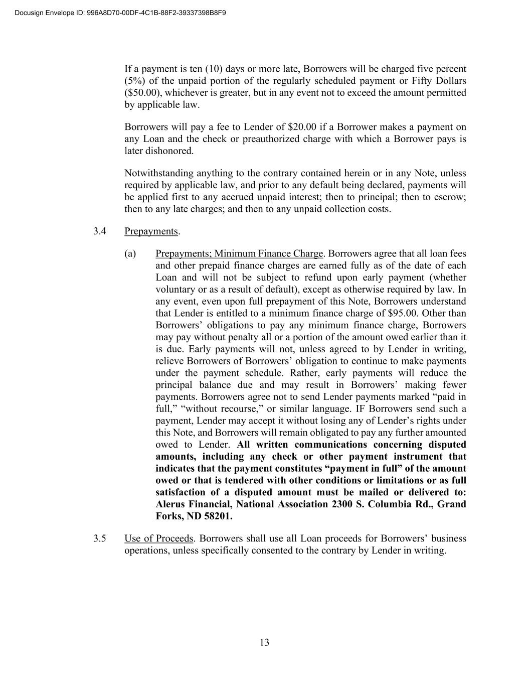 13 If a payment is ten (10) days or more late, Borrowers will be charged five percent (5%) of the unpaid portion of the regularly scheduled payment or Fifty Dollars ($50.00), whichever is greater, but in any event not to exceed the amount permitted by applicable law. Borrowers will pay a fee to Lender of $20.00 if a Borrower makes a payment on any Loan and the check or preauthorized charge with which a Borrower pays is later dishonored. Notwithstanding anything to the contrary contained herein or in any Note, unless required by applicable law, and prior to any default being declared, payments will be applied first to any accrued unpaid interest; then to principal; then to escrow; then to any late charges; and then to any unpaid collection costs. 3.4 Prepayments. (a) Prepayments; Minimum Finance Charge. Borrowers agree that all loan fees and other prepaid finance charges are earned fully as of the date of each Loan and will not be subject to refund upon early payment (whether voluntary or as a result of default), except as otherwise required by law. In any event, even upon full prepayment of this Note, Borrowers understand that Lender is entitled to a minimum finance charge of $95.00. Other than Borrowers’ obligations to pay any minimum finance charge, Borrowers may pay without penalty all or a portion of the amount owed earlier than it is due. Early payments will not, unless agreed to by Lender in writing, relieve Borrowers of Borrowers’ obligation to continue to make payments under the payment schedule. Rather, early payments will reduce the principal balance due and may result in Borrowers’ making fewer payments. Borrowers agree not to send Lender payments marked “paid in full,” “without recourse,” or similar language. IF Borrowers send such a payment, Lender may accept it without losing any of Lender’s rights under this Note, and Borrowers will remain obligated to pay any further amounted owed to Lender. All written communications concerning disputed amounts, including any check or other payment instrument that indicates that the payment constitutes “payment in full” of the amount owed or that is tendered with other conditions or limitations or as full satisfaction of a disputed amount must be mailed or delivered to: Alerus Financial, National Association 2300 S. Columbia Rd., Grand Forks, ND 58201. 3.5 Use of Proceeds. Borrowers shall use all Loan proceeds for Borrowers’ business operations, unless specifically consented to the contrary by Lender in writing. Docusign Envelope ID: 996A8D70-00DF-4C1B-88F2-39337398B8F9