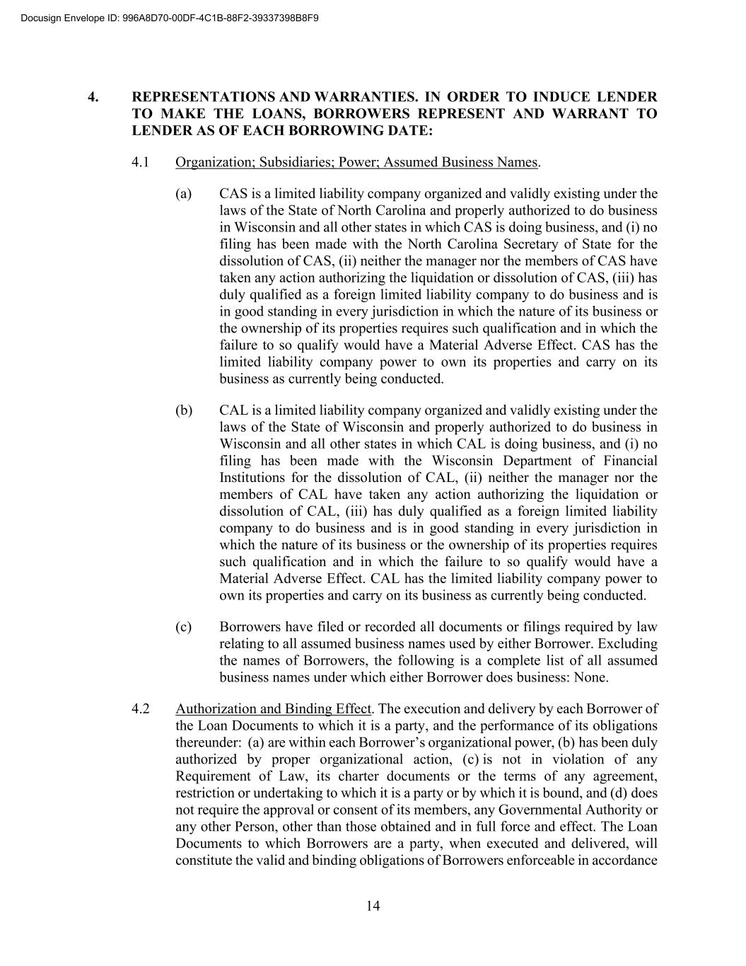 14 4. REPRESENTATIONS AND WARRANTIES. IN ORDER TO INDUCE LENDER TO MAKE THE LOANS, BORROWERS REPRESENT AND WARRANT TO LENDER AS OF EACH BORROWING DATE: 4.1 Organization; Subsidiaries; Power; Assumed Business Names. (a) CAS is a limited liability company organized and validly existing under the laws of the State of North Carolina and properly authorized to do business in Wisconsin and all other states in which CAS is doing business, and (i) no filing has been made with the North Carolina Secretary of State for the dissolution of CAS, (ii) neither the manager nor the members of CAS have taken any action authorizing the liquidation or dissolution of CAS, (iii) has duly qualified as a foreign limited liability company to do business and is in good standing in every jurisdiction in which the nature of its business or the ownership of its properties requires such qualification and in which the failure to so qualify would have a Material Adverse Effect. CAS has the limited liability company power to own its properties and carry on its business as currently being conducted. (b) CAL is a limited liability company organized and validly existing under the laws of the State of Wisconsin and properly authorized to do business in Wisconsin and all other states in which CAL is doing business, and (i) no filing has been made with the Wisconsin Department of Financial Institutions for the dissolution of CAL, (ii) neither the manager nor the members of CAL have taken any action authorizing the liquidation or dissolution of CAL, (iii) has duly qualified as a foreign limited liability company to do business and is in good standing in every jurisdiction in which the nature of its business or the ownership of its properties requires such qualification and in which the failure to so qualify would have a Material Adverse Effect. CAL has the limited liability company power to own its properties and carry on its business as currently being conducted. (c) Borrowers have filed or recorded all documents or filings required by law relating to all assumed business names used by either Borrower. Excluding the names of Borrowers, the following is a complete list of all assumed business names under which either Borrower does business: None. 4.2 Authorization and Binding Effect. The execution and delivery by each Borrower of the Loan Documents to which it is a party, and the performance of its obligations thereunder: (a) are within each Borrower’s organizational power, (b) has been duly authorized by proper organizational action, (c) is not in violation of any Requirement of Law, its charter documents or the terms of any agreement, restriction or undertaking to which it is a party or by which it is bound, and (d) does not require the approval or consent of its members, any Governmental Authority or any other Person, other than those obtained and in full force and effect. The Loan Documents to which Borrowers are a party, when executed and delivered, will constitute the valid and binding obligations of Borrowers enforceable in accordance Docusign Envelope ID: 996A8D70-00DF-4C1B-88F2-39337398B8F9