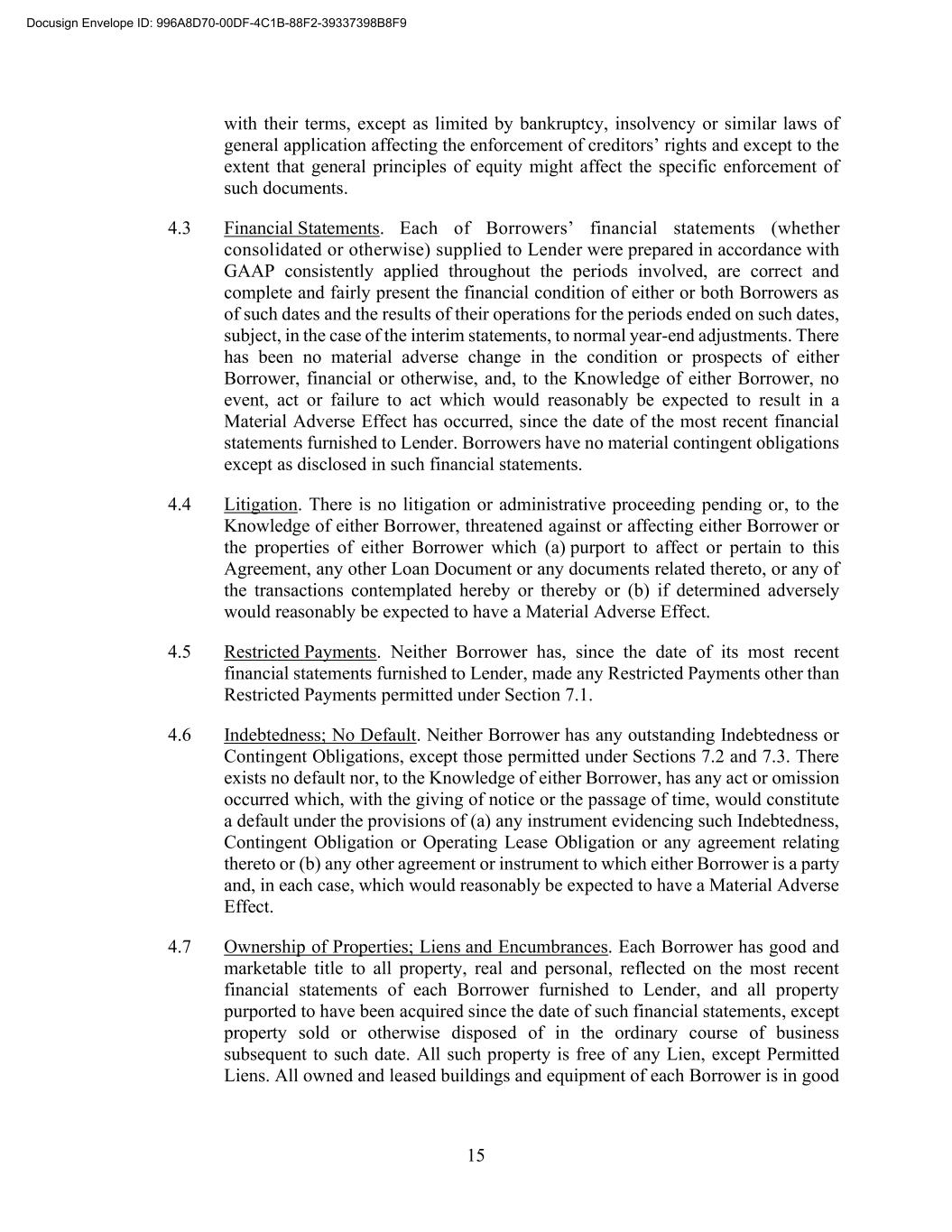 15 with their terms, except as limited by bankruptcy, insolvency or similar laws of general application affecting the enforcement of creditors’ rights and except to the extent that general principles of equity might affect the specific enforcement of such documents. 4.3 Financial Statements. Each of Borrowers’ financial statements (whether consolidated or otherwise) supplied to Lender were prepared in accordance with GAAP consistently applied throughout the periods involved, are correct and complete and fairly present the financial condition of either or both Borrowers as of such dates and the results of their operations for the periods ended on such dates, subject, in the case of the interim statements, to normal year-end adjustments. There has been no material adverse change in the condition or prospects of either Borrower, financial or otherwise, and, to the Knowledge of either Borrower, no event, act or failure to act which would reasonably be expected to result in a Material Adverse Effect has occurred, since the date of the most recent financial statements furnished to Lender. Borrowers have no material contingent obligations except as disclosed in such financial statements. 4.4 Litigation. There is no litigation or administrative proceeding pending or, to the Knowledge of either Borrower, threatened against or affecting either Borrower or the properties of either Borrower which (a) purport to affect or pertain to this Agreement, any other Loan Document or any documents related thereto, or any of the transactions contemplated hereby or thereby or (b) if determined adversely would reasonably be expected to have a Material Adverse Effect. 4.5 Restricted Payments. Neither Borrower has, since the date of its most recent financial statements furnished to Lender, made any Restricted Payments other than Restricted Payments permitted under Section 7.1. 4.6 Indebtedness; No Default. Neither Borrower has any outstanding Indebtedness or Contingent Obligations, except those permitted under Sections 7.2 and 7.3. There exists no default nor, to the Knowledge of either Borrower, has any act or omission occurred which, with the giving of notice or the passage of time, would constitute a default under the provisions of (a) any instrument evidencing such Indebtedness, Contingent Obligation or Operating Lease Obligation or any agreement relating thereto or (b) any other agreement or instrument to which either Borrower is a party and, in each case, which would reasonably be expected to have a Material Adverse Effect. 4.7 Ownership of Properties; Liens and Encumbrances. Each Borrower has good and marketable title to all property, real and personal, reflected on the most recent financial statements of each Borrower furnished to Lender, and all property purported to have been acquired since the date of such financial statements, except property sold or otherwise disposed of in the ordinary course of business subsequent to such date. All such property is free of any Lien, except Permitted Liens. All owned and leased buildings and equipment of each Borrower is in good Docusign Envelope ID: 996A8D70-00DF-4C1B-88F2-39337398B8F9