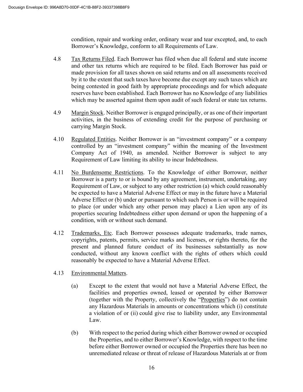 16 condition, repair and working order, ordinary wear and tear excepted, and, to each Borrower’s Knowledge, conform to all Requirements of Law. 4.8 Tax Returns Filed. Each Borrower has filed when due all federal and state income and other tax returns which are required to be filed. Each Borrower has paid or made provision for all taxes shown on said returns and on all assessments received by it to the extent that such taxes have become due except any such taxes which are being contested in good faith by appropriate proceedings and for which adequate reserves have been established. Each Borrower has no Knowledge of any liabilities which may be asserted against them upon audit of such federal or state tax returns. 4.9 Margin Stock. Neither Borrower is engaged principally, or as one of their important activities, in the business of extending credit for the purpose of purchasing or carrying Margin Stock. 4.10 Regulated Entities. Neither Borrower is an “investment company” or a company controlled by an “investment company” within the meaning of the Investment Company Act of 1940, as amended. Neither Borrower is subject to any Requirement of Law limiting its ability to incur Indebtedness. 4.11 No Burdensome Restrictions. To the Knowledge of either Borrower, neither Borrower is a party to or is bound by any agreement, instrument, undertaking, any Requirement of Law, or subject to any other restriction (a) which could reasonably be expected to have a Material Adverse Effect or may in the future have a Material Adverse Effect or (b) under or pursuant to which such Person is or will be required to place (or under which any other person may place) a Lien upon any of its properties securing Indebtedness either upon demand or upon the happening of a condition, with or without such demand. 4.12 Trademarks, Etc. Each Borrower possesses adequate trademarks, trade names, copyrights, patents, permits, service marks and licenses, or rights thereto, for the present and planned future conduct of its businesses substantially as now conducted, without any known conflict with the rights of others which could reasonably be expected to have a Material Adverse Effect. 4.13 Environmental Matters. (a) Except to the extent that would not have a Material Adverse Effect, the facilities and properties owned, leased or operated by either Borrower (together with the Property, collectively the “Properties”) do not contain any Hazardous Materials in amounts or concentrations which (i) constitute a violation of or (ii) could give rise to liability under, any Environmental Law. (b) With respect to the period during which either Borrower owned or occupied the Properties, and to either Borrower’s Knowledge, with respect to the time before either Borrower owned or occupied the Properties there has been no unremediated release or threat of release of Hazardous Materials at or from Docusign Envelope ID: 996A8D70-00DF-4C1B-88F2-39337398B8F9