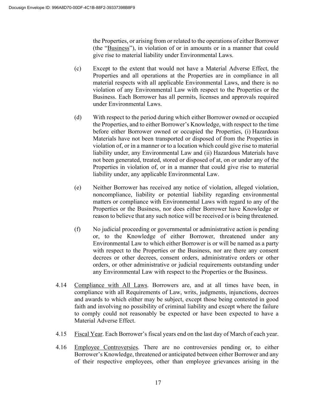 17 the Properties, or arising from or related to the operations of either Borrower (the “Business”), in violation of or in amounts or in a manner that could give rise to material liability under Environmental Laws. (c) Except to the extent that would not have a Material Adverse Effect, the Properties and all operations at the Properties are in compliance in all material respects with all applicable Environmental Laws, and there is no violation of any Environmental Law with respect to the Properties or the Business. Each Borrower has all permits, licenses and approvals required under Environmental Laws. (d) With respect to the period during which either Borrower owned or occupied the Properties, and to either Borrower’s Knowledge, with respect to the time before either Borrower owned or occupied the Properties, (i) Hazardous Materials have not been transported or disposed of from the Properties in violation of, or in a manner or to a location which could give rise to material liability under, any Environmental Law and (ii) Hazardous Materials have not been generated, treated, stored or disposed of at, on or under any of the Properties in violation of, or in a manner that could give rise to material liability under, any applicable Environmental Law. (e) Neither Borrower has received any notice of violation, alleged violation, noncompliance, liability or potential liability regarding environmental matters or compliance with Environmental Laws with regard to any of the Properties or the Business, nor does either Borrower have Knowledge or reason to believe that any such notice will be received or is being threatened. (f) No judicial proceeding or governmental or administrative action is pending or, to the Knowledge of either Borrower, threatened under any Environmental Law to which either Borrower is or will be named as a party with respect to the Properties or the Business, nor are there any consent decrees or other decrees, consent orders, administrative orders or other orders, or other administrative or judicial requirements outstanding under any Environmental Law with respect to the Properties or the Business. 4.14 Compliance with All Laws. Borrowers are, and at all times have been, in compliance with all Requirements of Law, writs, judgments, injunctions, decrees and awards to which either may be subject, except those being contested in good faith and involving no possibility of criminal liability and except where the failure to comply could not reasonably be expected or have been expected to have a Material Adverse Effect. 4.15 Fiscal Year. Each Borrower’s fiscal years end on the last day of March of each year. 4.16 Employee Controversies. There are no controversies pending or, to either Borrower’s Knowledge, threatened or anticipated between either Borrower and any of their respective employees, other than employee grievances arising in the Docusign Envelope ID: 996A8D70-00DF-4C1B-88F2-39337398B8F9