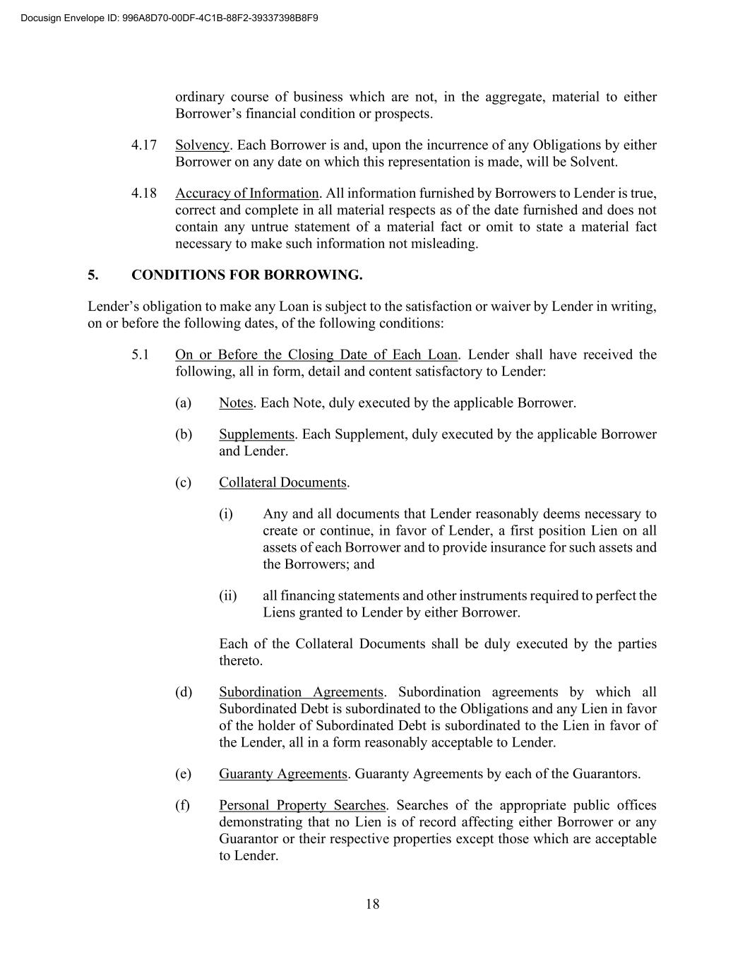 18 ordinary course of business which are not, in the aggregate, material to either Borrower’s financial condition or prospects. 4.17 Solvency. Each Borrower is and, upon the incurrence of any Obligations by either Borrower on any date on which this representation is made, will be Solvent. 4.18 Accuracy of Information. All information furnished by Borrowers to Lender is true, correct and complete in all material respects as of the date furnished and does not contain any untrue statement of a material fact or omit to state a material fact necessary to make such information not misleading. 5. CONDITIONS FOR BORROWING. Lender’s obligation to make any Loan is subject to the satisfaction or waiver by Lender in writing, on or before the following dates, of the following conditions: 5.1 On or Before the Closing Date of Each Loan. Lender shall have received the following, all in form, detail and content satisfactory to Lender: (a) Notes. Each Note, duly executed by the applicable Borrower. (b) Supplements. Each Supplement, duly executed by the applicable Borrower and Lender. (c) Collateral Documents. (i) Any and all documents that Lender reasonably deems necessary to create or continue, in favor of Lender, a first position Lien on all assets of each Borrower and to provide insurance for such assets and the Borrowers; and (ii) all financing statements and other instruments required to perfect the Liens granted to Lender by either Borrower. Each of the Collateral Documents shall be duly executed by the parties thereto. (d) Subordination Agreements. Subordination agreements by which all Subordinated Debt is subordinated to the Obligations and any Lien in favor of the holder of Subordinated Debt is subordinated to the Lien in favor of the Lender, all in a form reasonably acceptable to Lender. (e) Guaranty Agreements. Guaranty Agreements by each of the Guarantors. (f) Personal Property Searches. Searches of the appropriate public offices demonstrating that no Lien is of record affecting either Borrower or any Guarantor or their respective properties except those which are acceptable to Lender. Docusign Envelope ID: 996A8D70-00DF-4C1B-88F2-39337398B8F9