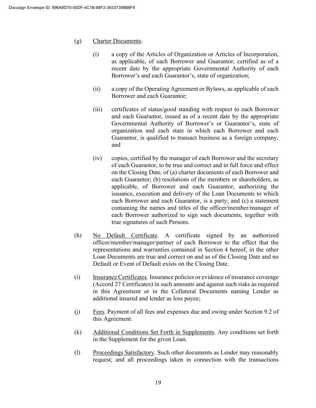 19 (g) Charter Documents. (i) a copy of the Articles of Organization or Articles of Incorporation, as applicable, of each Borrower and Guarantor, certified as of a recent date by the appropriate Governmental Authority of each Borrower’s and each Guarantor’s, state of organization; (ii) a copy of the Operating Agreement or Bylaws, as applicable of each Borrower and each Guarantor; (iii) certificates of status/good standing with respect to each Borrower and each Guarantor, issued as of a recent date by the appropriate Governmental Authority of Borrower’s or Guarantor’s, state of organization and each state in which each Borrower and each Guarantor, is qualified to transact business as a foreign company; and (iv) copies, certified by the manager of each Borrower and the secretary of each Guarantor, to be true and correct and in full force and effect on the Closing Date, of (a) charter documents of each Borrower and each Guarantor; (b) resolutions of the members or shareholders, as applicable, of Borrower and each Guarantor, authorizing the issuance, execution and delivery of the Loan Documents to which each Borrower and each Guarantor, is a party; and (c) a statement containing the names and titles of the officer/member/manager of each Borrower authorized to sign such documents, together with true signatures of such Persons. (h) No Default Certificate. A certificate signed by an authorized officer/member/manager/partner of each Borrower to the effect that the representations and warranties contained in Section 4 hereof, in the other Loan Documents are true and correct on and as of the Closing Date and no Default or Event of Default exists on the Closing Date. (i) Insurance Certificates. Insurance policies or evidence of insurance coverage (Accord 27 Certificates) in such amounts and against such risks as required in this Agreement or in the Collateral Documents naming Lender as additional insured and lender as loss payee; (j) Fees. Payment of all fees and expenses due and owing under Section 9.2 of this Agreement. (k) Additional Conditions Set Forth in Supplements. Any conditions set forth in the Supplement for the given Loan. (l) Proceedings Satisfactory. Such other documents as Lender may reasonably request; and all proceedings taken in connection with the transactions Docusign Envelope ID: 996A8D70-00DF-4C1B-88F2-39337398B8F9