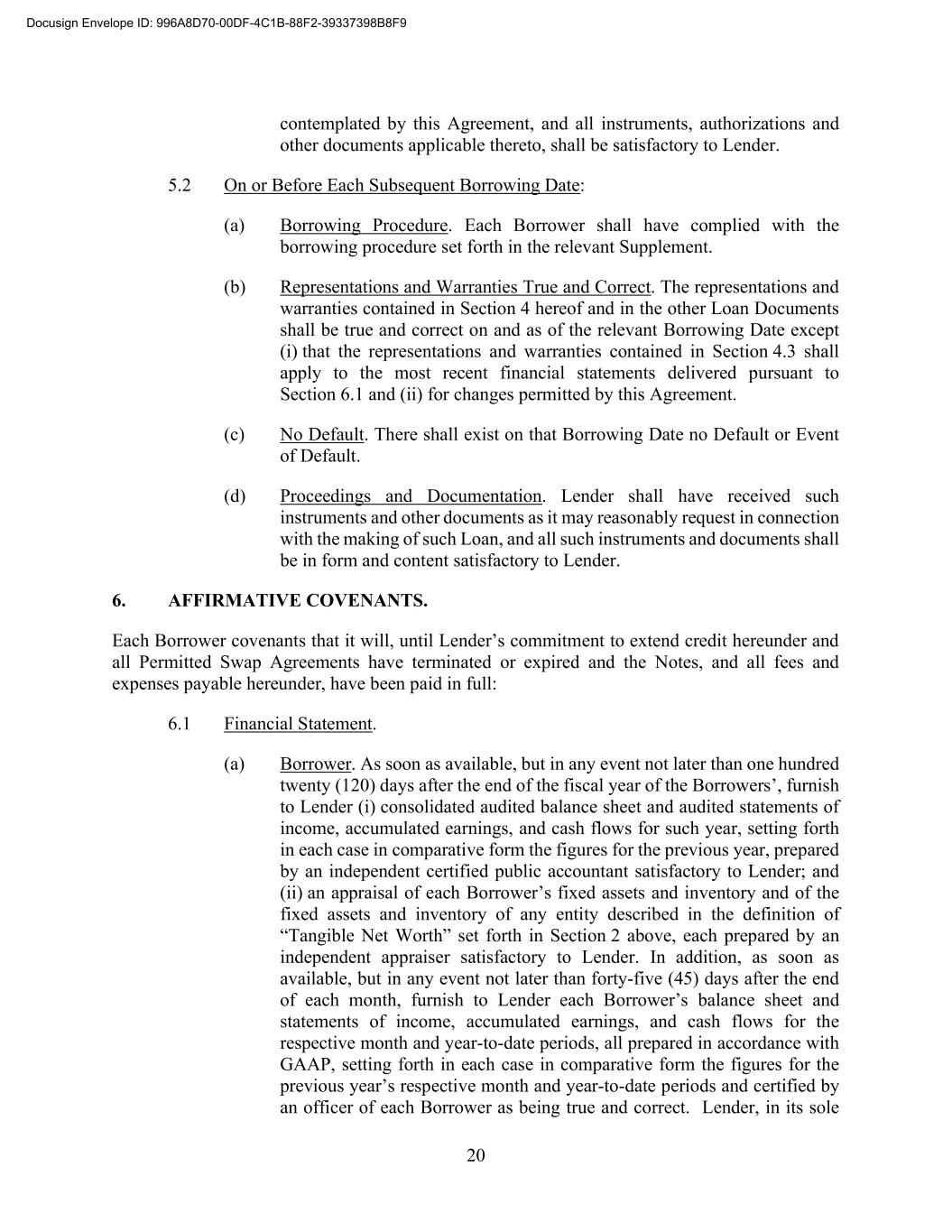 20 contemplated by this Agreement, and all instruments, authorizations and other documents applicable thereto, shall be satisfactory to Lender. 5.2 On or Before Each Subsequent Borrowing Date: (a) Borrowing Procedure. Each Borrower shall have complied with the borrowing procedure set forth in the relevant Supplement. (b) Representations and Warranties True and Correct. The representations and warranties contained in Section 4 hereof and in the other Loan Documents shall be true and correct on and as of the relevant Borrowing Date except (i) that the representations and warranties contained in Section 4.3 shall apply to the most recent financial statements delivered pursuant to Section 6.1 and (ii) for changes permitted by this Agreement. (c) No Default. There shall exist on that Borrowing Date no Default or Event of Default. (d) Proceedings and Documentation. Lender shall have received such instruments and other documents as it may reasonably request in connection with the making of such Loan, and all such instruments and documents shall be in form and content satisfactory to Lender. 6. AFFIRMATIVE COVENANTS. Each Borrower covenants that it will, until Lender’s commitment to extend credit hereunder and all Permitted Swap Agreements have terminated or expired and the Notes, and all fees and expenses payable hereunder, have been paid in full: 6.1 Financial Statement. (a) Borrower. As soon as available, but in any event not later than one hundred twenty (120) days after the end of the fiscal year of the Borrowers’, furnish to Lender (i) consolidated audited balance sheet and audited statements of income, accumulated earnings, and cash flows for such year, setting forth in each case in comparative form the figures for the previous year, prepared by an independent certified public accountant satisfactory to Lender; and (ii) an appraisal of each Borrower’s fixed assets and inventory and of the fixed assets and inventory of any entity described in the definition of “Tangible Net Worth” set forth in Section 2 above, each prepared by an independent appraiser satisfactory to Lender. In addition, as soon as available, but in any event not later than forty-five (45) days after the end of each month, furnish to Lender each Borrower’s balance sheet and statements of income, accumulated earnings, and cash flows for the respective month and year-to-date periods, all prepared in accordance with GAAP, setting forth in each case in comparative form the figures for the previous year’s respective month and year-to-date periods and certified by an officer of each Borrower as being true and correct. Lender, in its sole Docusign Envelope ID: 996A8D70-00DF-4C1B-88F2-39337398B8F9