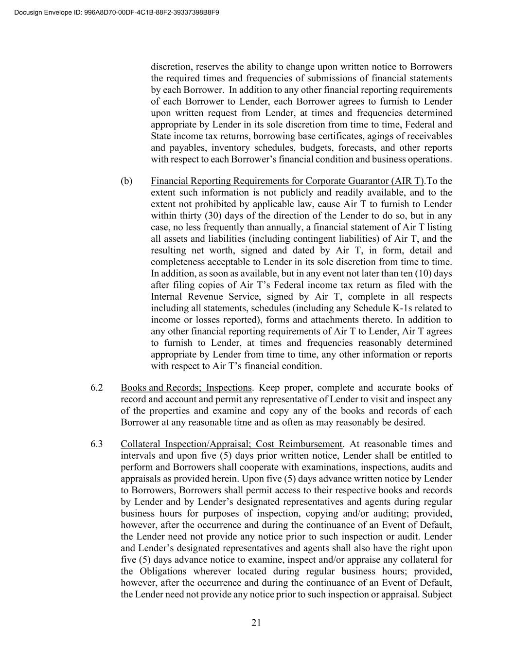 21 discretion, reserves the ability to change upon written notice to Borrowers the required times and frequencies of submissions of financial statements by each Borrower. In addition to any other financial reporting requirements of each Borrower to Lender, each Borrower agrees to furnish to Lender upon written request from Lender, at times and frequencies determined appropriate by Lender in its sole discretion from time to time, Federal and State income tax returns, borrowing base certificates, agings of receivables and payables, inventory schedules, budgets, forecasts, and other reports with respect to each Borrower’s financial condition and business operations. (b) Financial Reporting Requirements for Corporate Guarantor (AIR T).To the extent such information is not publicly and readily available, and to the extent not prohibited by applicable law, cause Air T to furnish to Lender within thirty (30) days of the direction of the Lender to do so, but in any case, no less frequently than annually, a financial statement of Air T listing all assets and liabilities (including contingent liabilities) of Air T, and the resulting net worth, signed and dated by Air T, in form, detail and completeness acceptable to Lender in its sole discretion from time to time. In addition, as soon as available, but in any event not later than ten (10) days after filing copies of Air T’s Federal income tax return as filed with the Internal Revenue Service, signed by Air T, complete in all respects including all statements, schedules (including any Schedule K-1s related to income or losses reported), forms and attachments thereto. In addition to any other financial reporting requirements of Air T to Lender, Air T agrees to furnish to Lender, at times and frequencies reasonably determined appropriate by Lender from time to time, any other information or reports with respect to Air T’s financial condition. 6.2 Books and Records; Inspections. Keep proper, complete and accurate books of record and account and permit any representative of Lender to visit and inspect any of the properties and examine and copy any of the books and records of each Borrower at any reasonable time and as often as may reasonably be desired. 6.3 Collateral Inspection/Appraisal; Cost Reimbursement. At reasonable times and intervals and upon five (5) days prior written notice, Lender shall be entitled to perform and Borrowers shall cooperate with examinations, inspections, audits and appraisals as provided herein. Upon five (5) days advance written notice by Lender to Borrowers, Borrowers shall permit access to their respective books and records by Lender and by Lender’s designated representatives and agents during regular business hours for purposes of inspection, copying and/or auditing; provided, however, after the occurrence and during the continuance of an Event of Default, the Lender need not provide any notice prior to such inspection or audit. Lender and Lender’s designated representatives and agents shall also have the right upon five (5) days advance notice to examine, inspect and/or appraise any collateral for the Obligations wherever located during regular business hours; provided, however, after the occurrence and during the continuance of an Event of Default, the Lender need not provide any notice prior to such inspection or appraisal. Subject Docusign Envelope ID: 996A8D70-00DF-4C1B-88F2-39337398B8F9