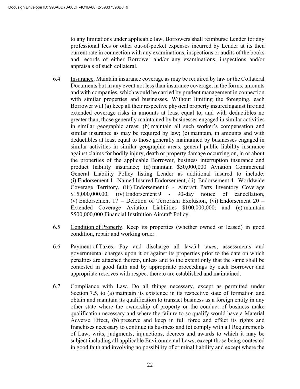 22 to any limitations under applicable law, Borrowers shall reimburse Lender for any professional fees or other out-of-pocket expenses incurred by Lender at its then current rate in connection with any examinations, inspections or audits of the books and records of either Borrower and/or any examinations, inspections and/or appraisals of such collateral. 6.4 Insurance. Maintain insurance coverage as may be required by law or the Collateral Documents but in any event not less than insurance coverage, in the forms, amounts and with companies, which would be carried by prudent management in connection with similar properties and businesses. Without limiting the foregoing, each Borrower will (a) keep all their respective physical property insured against fire and extended coverage risks in amounts at least equal to, and with deductibles no greater than, those generally maintained by businesses engaged in similar activities in similar geographic areas; (b) maintain all such worker’s compensation and similar insurance as may be required by law; (c) maintain, in amounts and with deductibles at least equal to those generally maintained by businesses engaged in similar activities in similar geographic areas, general public liability insurance against claims for bodily injury, death or property damage occurring on, in or about the properties of the applicable Borrower, business interruption insurance and product liability insurance; (d) maintain $50,000,000 Aviation Commercial General Liability Policy listing Lender as additional insured to include: (i) Endorsement 1 - Named Insured Endorsement, (ii) Endorsement 4 - Worldwide Coverage Territory, (iii) Endorsement 6 - Aircraft Parts Inventory Coverage $15,000,000.00, (iv) Endorsement 9 - 90-day notice of cancellation, (v) Endorsement 17 – Deletion of Terrorism Exclusion, (vi) Endorsement 20 – Extended Coverage Aviation Liabilities $100,000,000; and (e) maintain $500,000,000 Financial Institution Aircraft Policy. 6.5 Condition of Property. Keep its properties (whether owned or leased) in good condition, repair and working order. 6.6 Payment of Taxes. Pay and discharge all lawful taxes, assessments and governmental charges upon it or against its properties prior to the date on which penalties are attached thereto, unless and to the extent only that the same shall be contested in good faith and by appropriate proceedings by each Borrower and appropriate reserves with respect thereto are established and maintained. 6.7 Compliance with Law. Do all things necessary, except as permitted under Section 7.5, to (a) maintain its existence in its respective state of formation and obtain and maintain its qualification to transact business as a foreign entity in any other state where the ownership of property or the conduct of business make qualification necessary and where the failure to so qualify would have a Material Adverse Effect, (b) preserve and keep in full force and effect its rights and franchises necessary to continue its business and (c) comply with all Requirements of Law, writs, judgments, injunctions, decrees and awards to which it may be subject including all applicable Environmental Laws, except those being contested in good faith and involving no possibility of criminal liability and except where the Docusign Envelope ID: 996A8D70-00DF-4C1B-88F2-39337398B8F9