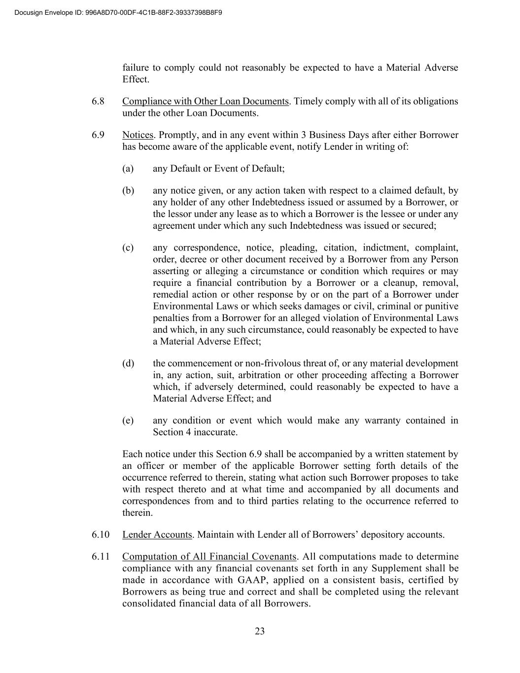 23 failure to comply could not reasonably be expected to have a Material Adverse Effect. 6.8 Compliance with Other Loan Documents. Timely comply with all of its obligations under the other Loan Documents. 6.9 Notices. Promptly, and in any event within 3 Business Days after either Borrower has become aware of the applicable event, notify Lender in writing of: (a) any Default or Event of Default; (b) any notice given, or any action taken with respect to a claimed default, by any holder of any other Indebtedness issued or assumed by a Borrower, or the lessor under any lease as to which a Borrower is the lessee or under any agreement under which any such Indebtedness was issued or secured; (c) any correspondence, notice, pleading, citation, indictment, complaint, order, decree or other document received by a Borrower from any Person asserting or alleging a circumstance or condition which requires or may require a financial contribution by a Borrower or a cleanup, removal, remedial action or other response by or on the part of a Borrower under Environmental Laws or which seeks damages or civil, criminal or punitive penalties from a Borrower for an alleged violation of Environmental Laws and which, in any such circumstance, could reasonably be expected to have a Material Adverse Effect; (d) the commencement or non-frivolous threat of, or any material development in, any action, suit, arbitration or other proceeding affecting a Borrower which, if adversely determined, could reasonably be expected to have a Material Adverse Effect; and (e) any condition or event which would make any warranty contained in Section 4 inaccurate. Each notice under this Section 6.9 shall be accompanied by a written statement by an officer or member of the applicable Borrower setting forth details of the occurrence referred to therein, stating what action such Borrower proposes to take with respect thereto and at what time and accompanied by all documents and correspondences from and to third parties relating to the occurrence referred to therein. 6.10 Lender Accounts. Maintain with Lender all of Borrowers’ depository accounts. 6.11 Computation of All Financial Covenants. All computations made to determine compliance with any financial covenants set forth in any Supplement shall be made in accordance with GAAP, applied on a consistent basis, certified by Borrowers as being true and correct and shall be completed using the relevant consolidated financial data of all Borrowers. Docusign Envelope ID: 996A8D70-00DF-4C1B-88F2-39337398B8F9