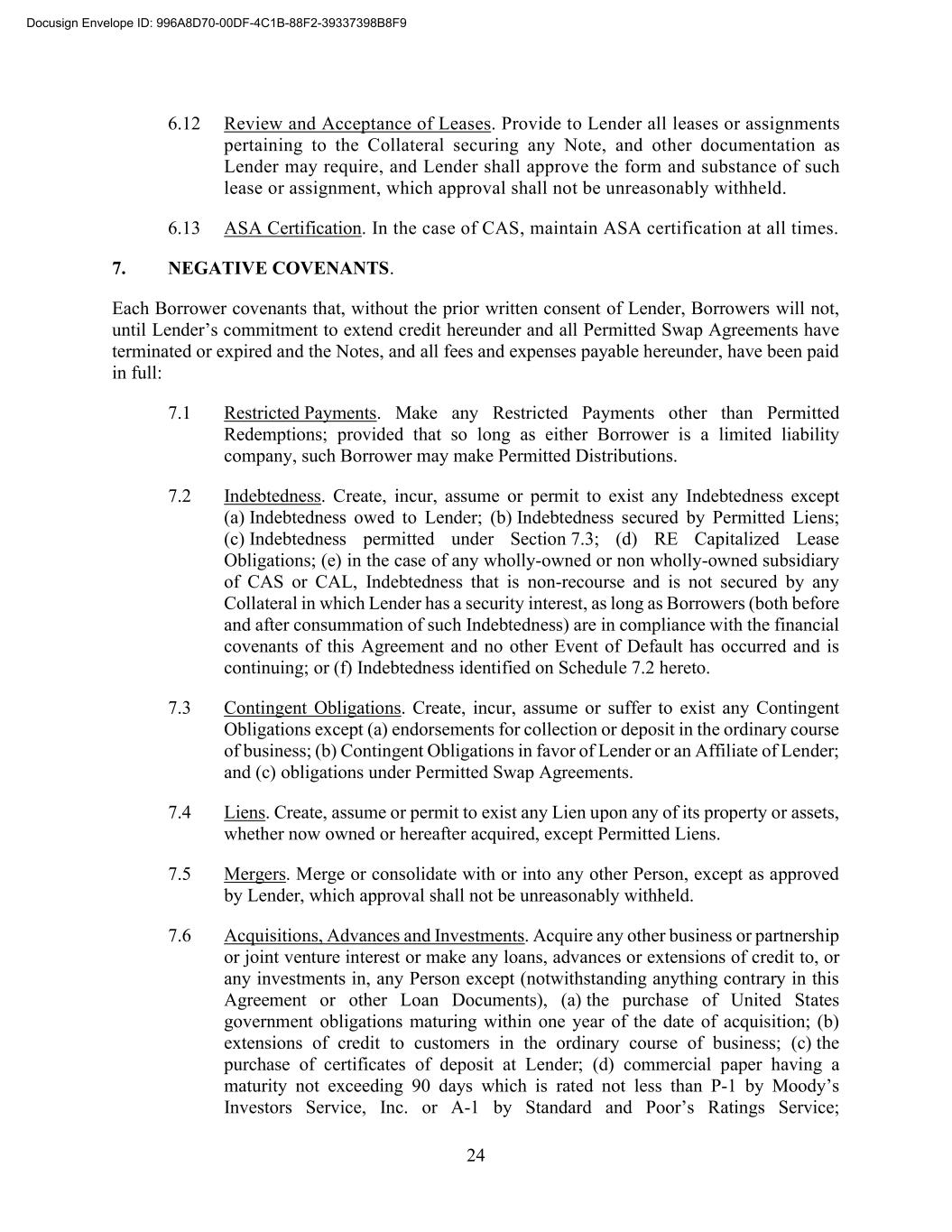24 6.12 Review and Acceptance of Leases. Provide to Lender all leases or assignments pertaining to the Collateral securing any Note, and other documentation as Lender may require, and Lender shall approve the form and substance of such lease or assignment, which approval shall not be unreasonably withheld. 6.13 ASA Certification. In the case of CAS, maintain ASA certification at all times. 7. NEGATIVE COVENANTS. Each Borrower covenants that, without the prior written consent of Lender, Borrowers will not, until Lender’s commitment to extend credit hereunder and all Permitted Swap Agreements have terminated or expired and the Notes, and all fees and expenses payable hereunder, have been paid in full: 7.1 Restricted Payments. Make any Restricted Payments other than Permitted Redemptions; provided that so long as either Borrower is a limited liability company, such Borrower may make Permitted Distributions. 7.2 Indebtedness. Create, incur, assume or permit to exist any Indebtedness except (a) Indebtedness owed to Lender; (b) Indebtedness secured by Permitted Liens; (c) Indebtedness permitted under Section 7.3; (d) RE Capitalized Lease Obligations; (e) in the case of any wholly-owned or non wholly-owned subsidiary of CAS or CAL, Indebtedness that is non-recourse and is not secured by any Collateral in which Lender has a security interest, as long as Borrowers (both before and after consummation of such Indebtedness) are in compliance with the financial covenants of this Agreement and no other Event of Default has occurred and is continuing; or (f) Indebtedness identified on Schedule 7.2 hereto. 7.3 Contingent Obligations. Create, incur, assume or suffer to exist any Contingent Obligations except (a) endorsements for collection or deposit in the ordinary course of business; (b) Contingent Obligations in favor of Lender or an Affiliate of Lender; and (c) obligations under Permitted Swap Agreements. 7.4 Liens. Create, assume or permit to exist any Lien upon any of its property or assets, whether now owned or hereafter acquired, except Permitted Liens. 7.5 Mergers. Merge or consolidate with or into any other Person, except as approved by Lender, which approval shall not be unreasonably withheld. 7.6 Acquisitions, Advances and Investments. Acquire any other business or partnership or joint venture interest or make any loans, advances or extensions of credit to, or any investments in, any Person except (notwithstanding anything contrary in this Agreement or other Loan Documents), (a) the purchase of United States government obligations maturing within one year of the date of acquisition; (b) extensions of credit to customers in the ordinary course of business; (c) the purchase of certificates of deposit at Lender; (d) commercial paper having a maturity not exceeding 90 days which is rated not less than P-1 by Moody’s Investors Service, Inc. or A-1 by Standard and Poor’s Ratings Service; Docusign Envelope ID: 996A8D70-00DF-4C1B-88F2-39337398B8F9