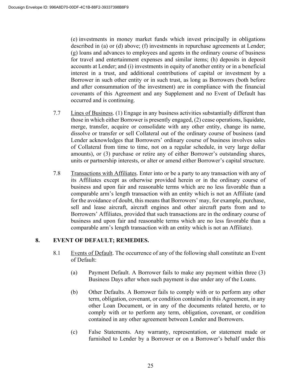 25 (e) investments in money market funds which invest principally in obligations described in (a) or (d) above; (f) investments in repurchase agreements at Lender; (g) loans and advances to employees and agents in the ordinary course of business for travel and entertainment expenses and similar items; (h) deposits in deposit accounts at Lender; and (i) investments in equity of another entity or in a beneficial interest in a trust, and additional contributions of capital or investment by a Borrower in such other entity or in such trust, as long as Borrowers (both before and after consummation of the investment) are in compliance with the financial covenants of this Agreement and any Supplement and no Event of Default has occurred and is continuing. 7.7 Lines of Business. (1) Engage in any business activities substantially different than those in which either Borrower is presently engaged, (2) cease operations, liquidate, merge, transfer, acquire or consolidate with any other entity, change its name, dissolve or transfer or sell Collateral out of the ordinary course of business (and Lender acknowledges that Borrowers’ ordinary course of business involves sales of Collateral from time to time, not on a regular schedule, in very large dollar amounts), or (3) purchase or retire any of either Borrower’s outstanding shares, units or partnership interests, or alter or amend either Borrower’s capital structure. 7.8 Transactions with Affiliates. Enter into or be a party to any transaction with any of its Affiliates except as otherwise provided herein or in the ordinary course of business and upon fair and reasonable terms which are no less favorable than a comparable arm’s length transaction with an entity which is not an Affiliate (and for the avoidance of doubt, this means that Borrowers’ may, for example, purchase, sell and lease aircraft, aircraft engines and other aircraft parts from and to Borrowers’ Affiliates, provided that such transactions are in the ordinary course of business and upon fair and reasonable terms which are no less favorable than a comparable arm’s length transaction with an entity which is not an Affiliate). 8. EVENT OF DEFAULT; REMEDIES. 8.1 Events of Default. The occurrence of any of the following shall constitute an Event of Default: (a) Payment Default. A Borrower fails to make any payment within three (3) Business Days after when such payment is due under any of the Loans. (b) Other Defaults. A Borrower fails to comply with or to perform any other term, obligation, covenant, or condition contained in this Agreement, in any other Loan Document, or in any of the documents related hereto, or to comply with or to perform any term, obligation, covenant, or condition contained in any other agreement between Lender and Borrowers. (c) False Statements. Any warranty, representation, or statement made or furnished to Lender by a Borrower or on a Borrower’s behalf under this Docusign Envelope ID: 996A8D70-00DF-4C1B-88F2-39337398B8F9