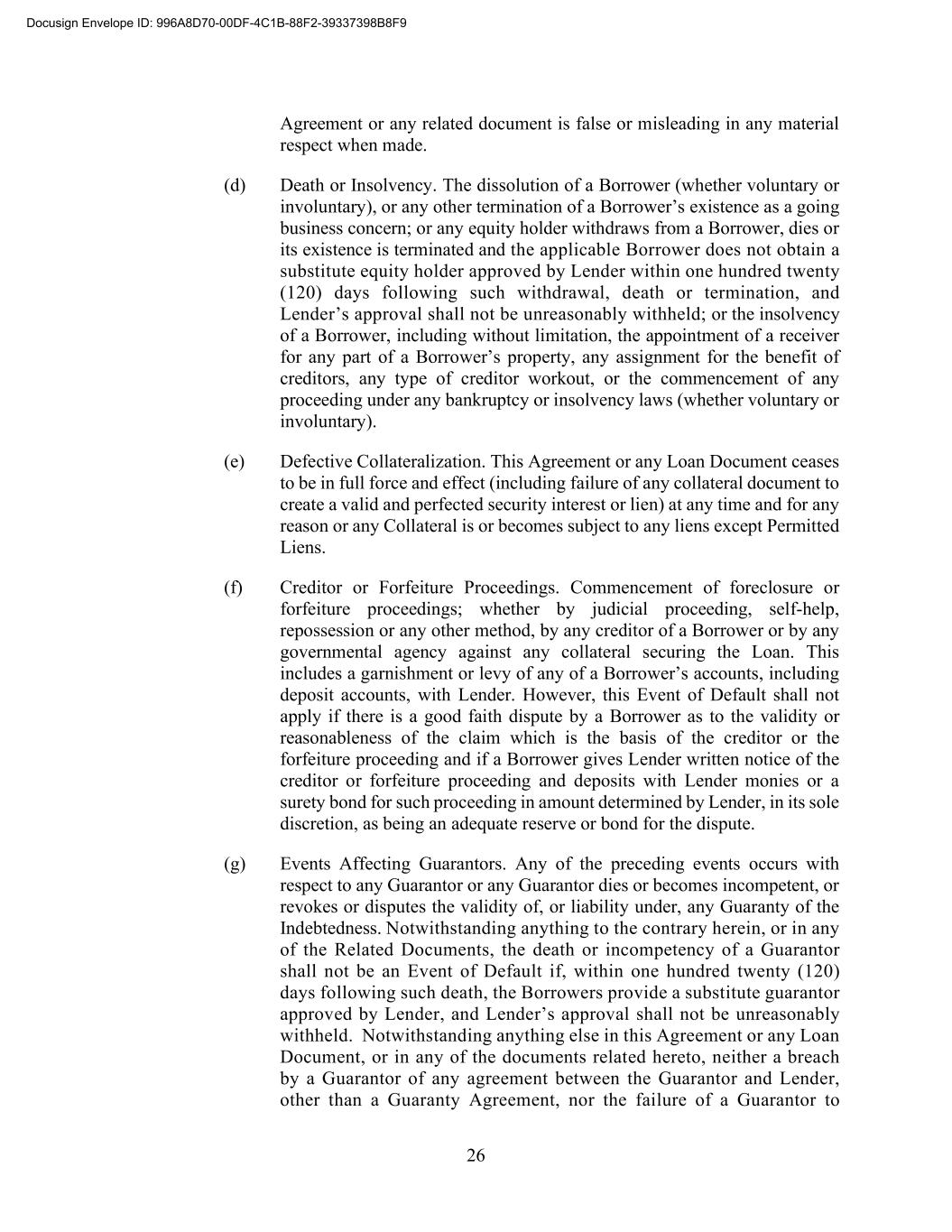 26 Agreement or any related document is false or misleading in any material respect when made. (d) Death or Insolvency. The dissolution of a Borrower (whether voluntary or involuntary), or any other termination of a Borrower’s existence as a going business concern; or any equity holder withdraws from a Borrower, dies or its existence is terminated and the applicable Borrower does not obtain a substitute equity holder approved by Lender within one hundred twenty (120) days following such withdrawal, death or termination, and Lender’s approval shall not be unreasonably withheld; or the insolvency of a Borrower, including without limitation, the appointment of a receiver for any part of a Borrower’s property, any assignment for the benefit of creditors, any type of creditor workout, or the commencement of any proceeding under any bankruptcy or insolvency laws (whether voluntary or involuntary). (e) Defective Collateralization. This Agreement or any Loan Document ceases to be in full force and effect (including failure of any collateral document to create a valid and perfected security interest or lien) at any time and for any reason or any Collateral is or becomes subject to any liens except Permitted Liens. (f) Creditor or Forfeiture Proceedings. Commencement of foreclosure or forfeiture proceedings; whether by judicial proceeding, self-help, repossession or any other method, by any creditor of a Borrower or by any governmental agency against any collateral securing the Loan. This includes a garnishment or levy of any of a Borrower’s accounts, including deposit accounts, with Lender. However, this Event of Default shall not apply if there is a good faith dispute by a Borrower as to the validity or reasonableness of the claim which is the basis of the creditor or the forfeiture proceeding and if a Borrower gives Lender written notice of the creditor or forfeiture proceeding and deposits with Lender monies or a surety bond for such proceeding in amount determined by Lender, in its sole discretion, as being an adequate reserve or bond for the dispute. (g) Events Affecting Guarantors. Any of the preceding events occurs with respect to any Guarantor or any Guarantor dies or becomes incompetent, or revokes or disputes the validity of, or liability under, any Guaranty of the Indebtedness. Notwithstanding anything to the contrary herein, or in any of the Related Documents, the death or incompetency of a Guarantor shall not be an Event of Default if, within one hundred twenty (120) days following such death, the Borrowers provide a substitute guarantor approved by Lender, and Lender’s approval shall not be unreasonably withheld. Notwithstanding anything else in this Agreement or any Loan Document, or in any of the documents related hereto, neither a breach by a Guarantor of any agreement between the Guarantor and Lender, other than a Guaranty Agreement, nor the failure of a Guarantor to Docusign Envelope ID: 996A8D70-00DF-4C1B-88F2-39337398B8F9