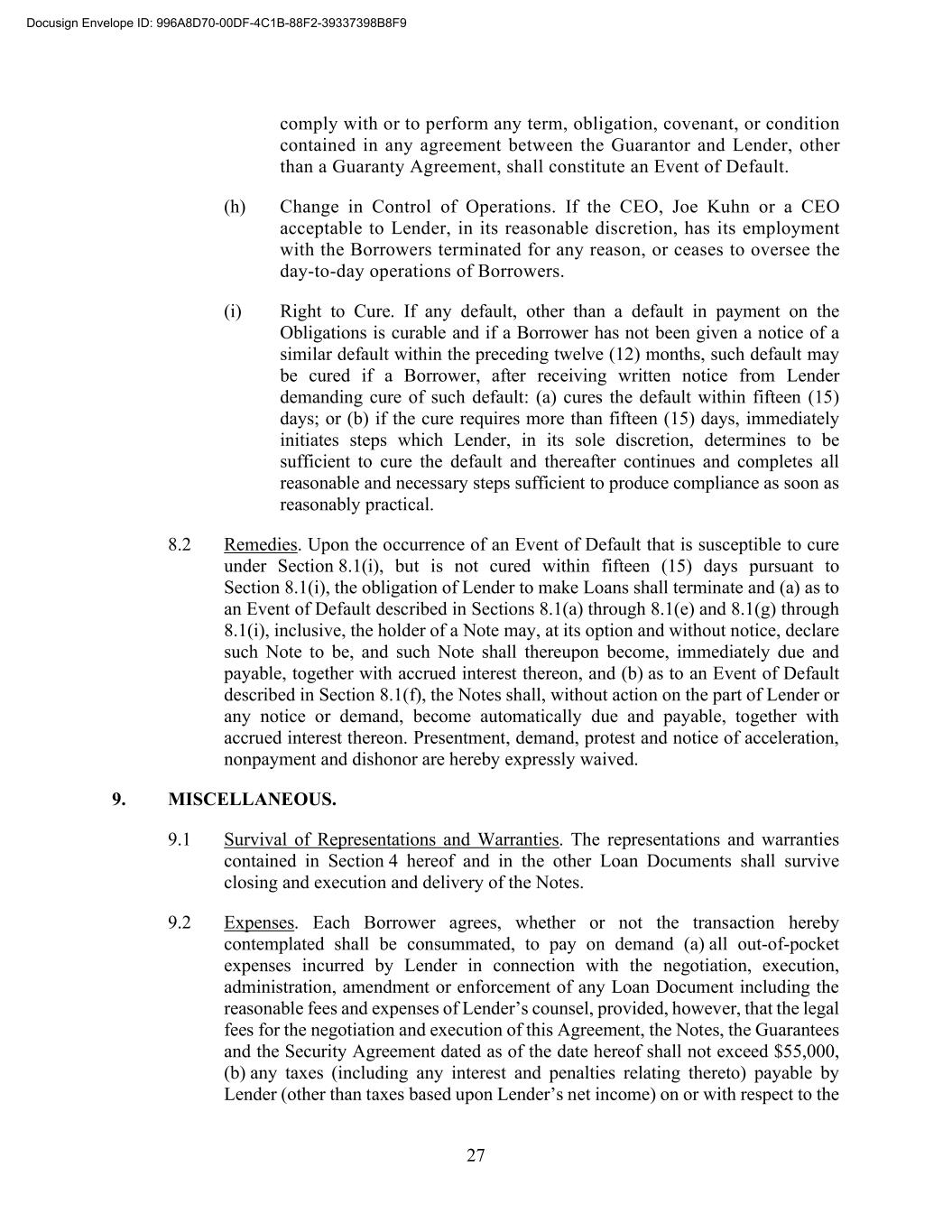 27 comply with or to perform any term, obligation, covenant, or condition contained in any agreement between the Guarantor and Lender, other than a Guaranty Agreement, shall constitute an Event of Default. (h) Change in Control of Operations. If the CEO, Joe Kuhn or a CEO acceptable to Lender, in its reasonable discretion, has its employment with the Borrowers terminated for any reason, or ceases to oversee the day-to-day operations of Borrowers. (i) Right to Cure. If any default, other than a default in payment on the Obligations is curable and if a Borrower has not been given a notice of a similar default within the preceding twelve (12) months, such default may be cured if a Borrower, after receiving written notice from Lender demanding cure of such default: (a) cures the default within fifteen (15) days; or (b) if the cure requires more than fifteen (15) days, immediately initiates steps which Lender, in its sole discretion, determines to be sufficient to cure the default and thereafter continues and completes all reasonable and necessary steps sufficient to produce compliance as soon as reasonably practical. 8.2 Remedies. Upon the occurrence of an Event of Default that is susceptible to cure under Section 8.1(i), but is not cured within fifteen (15) days pursuant to Section 8.1(i), the obligation of Lender to make Loans shall terminate and (a) as to an Event of Default described in Sections 8.1(a) through 8.1(e) and 8.1(g) through 8.1(i), inclusive, the holder of a Note may, at its option and without notice, declare such Note to be, and such Note shall thereupon become, immediately due and payable, together with accrued interest thereon, and (b) as to an Event of Default described in Section 8.1(f), the Notes shall, without action on the part of Lender or any notice or demand, become automatically due and payable, together with accrued interest thereon. Presentment, demand, protest and notice of acceleration, nonpayment and dishonor are hereby expressly waived. 9. MISCELLANEOUS. 9.1 Survival of Representations and Warranties. The representations and warranties contained in Section 4 hereof and in the other Loan Documents shall survive closing and execution and delivery of the Notes. 9.2 Expenses. Each Borrower agrees, whether or not the transaction hereby contemplated shall be consummated, to pay on demand (a) all out-of-pocket expenses incurred by Lender in connection with the negotiation, execution, administration, amendment or enforcement of any Loan Document including the reasonable fees and expenses of Lender’s counsel, provided, however, that the legal fees for the negotiation and execution of this Agreement, the Notes, the Guarantees and the Security Agreement dated as of the date hereof shall not exceed $55,000, (b) any taxes (including any interest and penalties relating thereto) payable by Lender (other than taxes based upon Lender’s net income) on or with respect to the Docusign Envelope ID: 996A8D70-00DF-4C1B-88F2-39337398B8F9