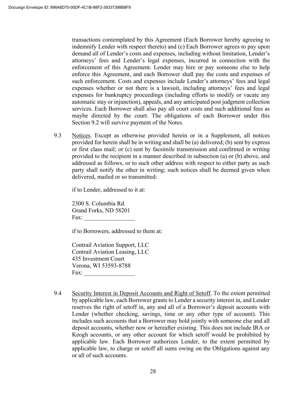 28 transactions contemplated by this Agreement (Each Borrower hereby agreeing to indemnify Lender with respect thereto) and (c) Each Borrower agrees to pay upon demand all of Lender’s costs and expenses, including without limitation, Lender’s attorneys’ fees and Lender’s legal expenses, incurred in connection with the enforcement of this Agreement. Lender may hire or pay someone else to help enforce this Agreement, and each Borrower shall pay the costs and expenses of such enforcement. Costs and expenses include Lender’s attorneys’ fees and legal expenses whether or not there is a lawsuit, including attorneys’ fees and legal expenses for bankruptcy proceedings (including efforts to modify or vacate any automatic stay or injunction), appeals, and any anticipated post judgment collection services. Each Borrower shall also pay all court costs and such additional fees as maybe directed by the court. The obligations of each Borrower under this Section 9.2 will survive payment of the Notes. 9.3 Notices. Except as otherwise provided herein or in a Supplement, all notices provided for herein shall be in writing and shall be (a) delivered; (b) sent by express or first class mail; or (c) sent by facsimile transmission and confirmed in writing provided to the recipient in a manner described in subsection (a) or (b) above, and addressed as follows, or to such other address with respect to either party as such party shall notify the other in writing; such notices shall be deemed given when delivered, mailed or so transmitted: if to Lender, addressed to it at: 2300 S. Columbia Rd. Grand Forks, ND 58201 Fax: _________________ if to Borrowers, addressed to them at: Contrail Aviation Support, LLC Contrail Aviation Leasing, LLC 435 Investment Court Verona, WI 53593-8788 Fax: _________________ 9.4 Security Interest in Deposit Accounts and Right of Setoff. To the extent permitted by applicable law, each Borrower grants to Lender a security interest in, and Lender reserves the right of setoff in, any and all of a Borrower’s deposit accounts with Lender (whether checking, savings, time or any other type of account). This includes such accounts that a Borrower may hold jointly with someone else and all deposit accounts, whether now or hereafter existing. This does not include IRA or Keogh accounts, or any other account for which setoff would be prohibited by applicable law. Each Borrower authorizes Lender, to the extent permitted by applicable law, to charge or setoff all sums owing on the Obligations against any or all of such accounts. Docusign Envelope ID: 996A8D70-00DF-4C1B-88F2-39337398B8F9